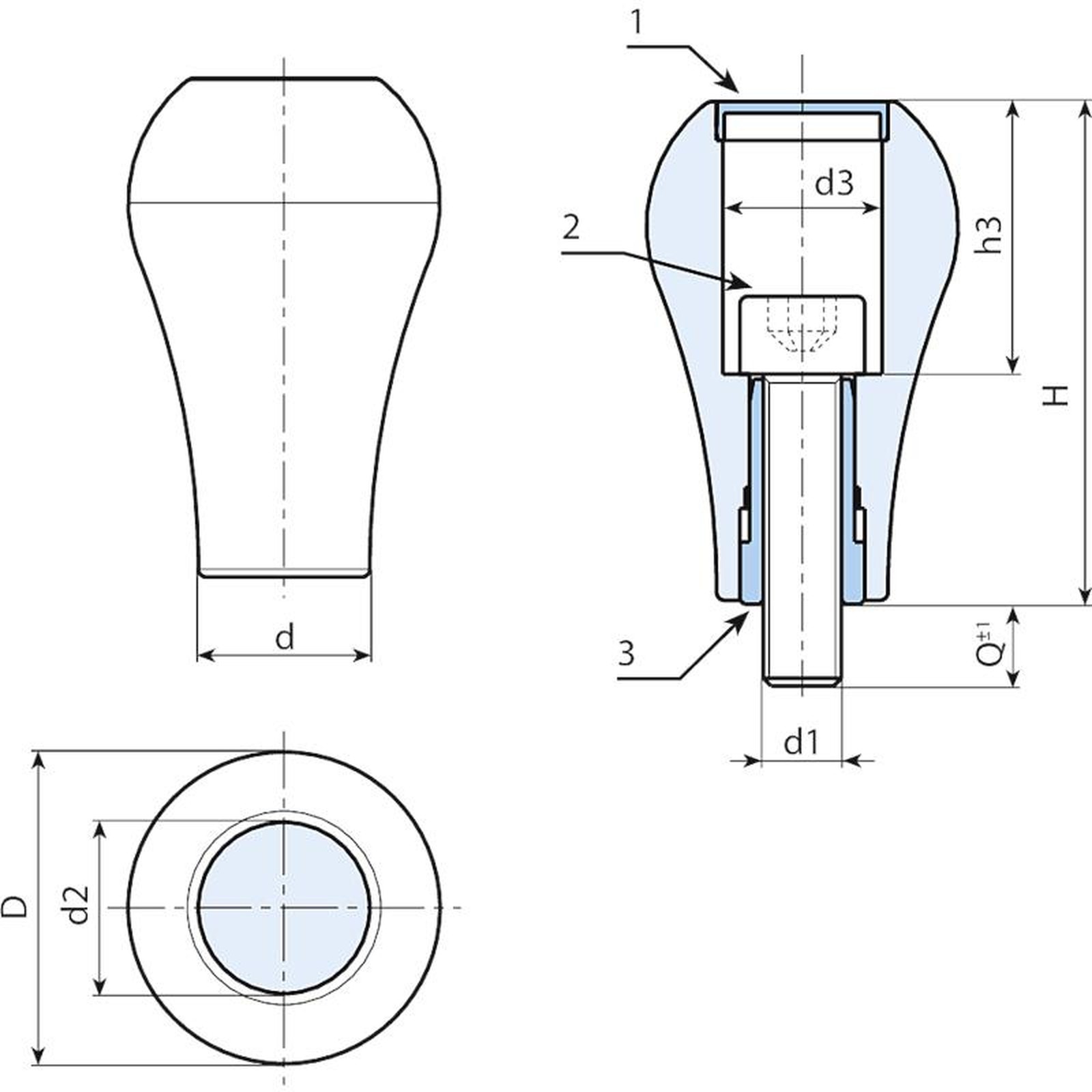 | Code | art. | H | D | d | d2 | d3 | h3 | d1 6g | Q | Weight (g) |