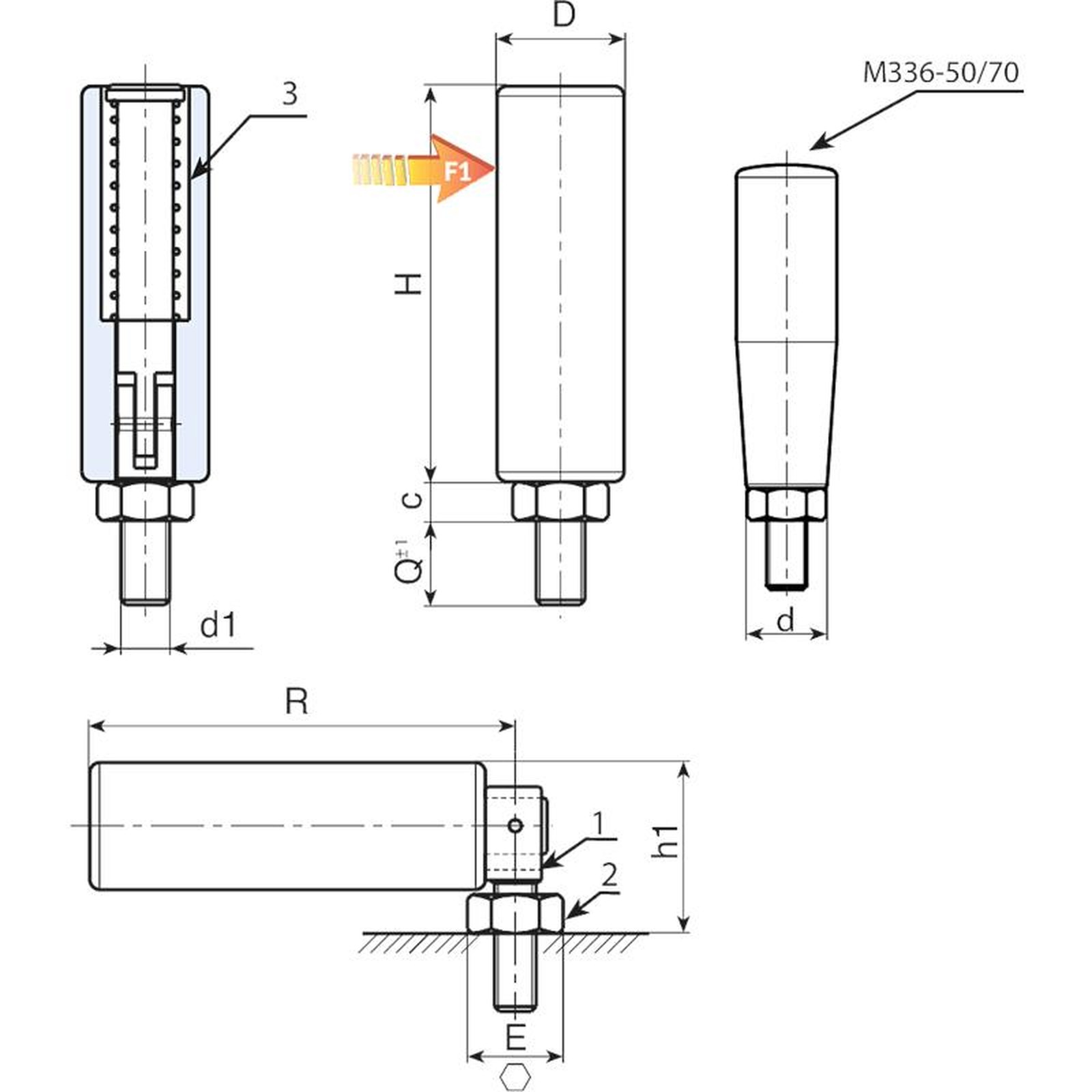 | Code | art. | H | D | d | E | R | c | h1 | d1 6g | Q | Weight (g) | F1 (N) |