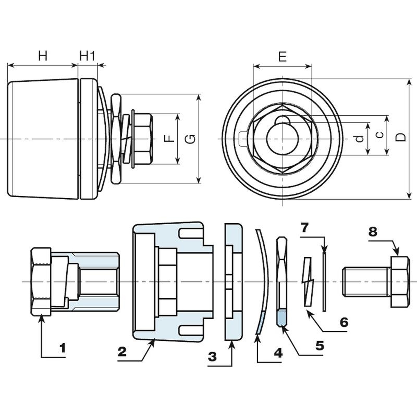 | Code | art. | D | H | H1 | d | c | E | F | G | Weight (g) | Amp. Max |