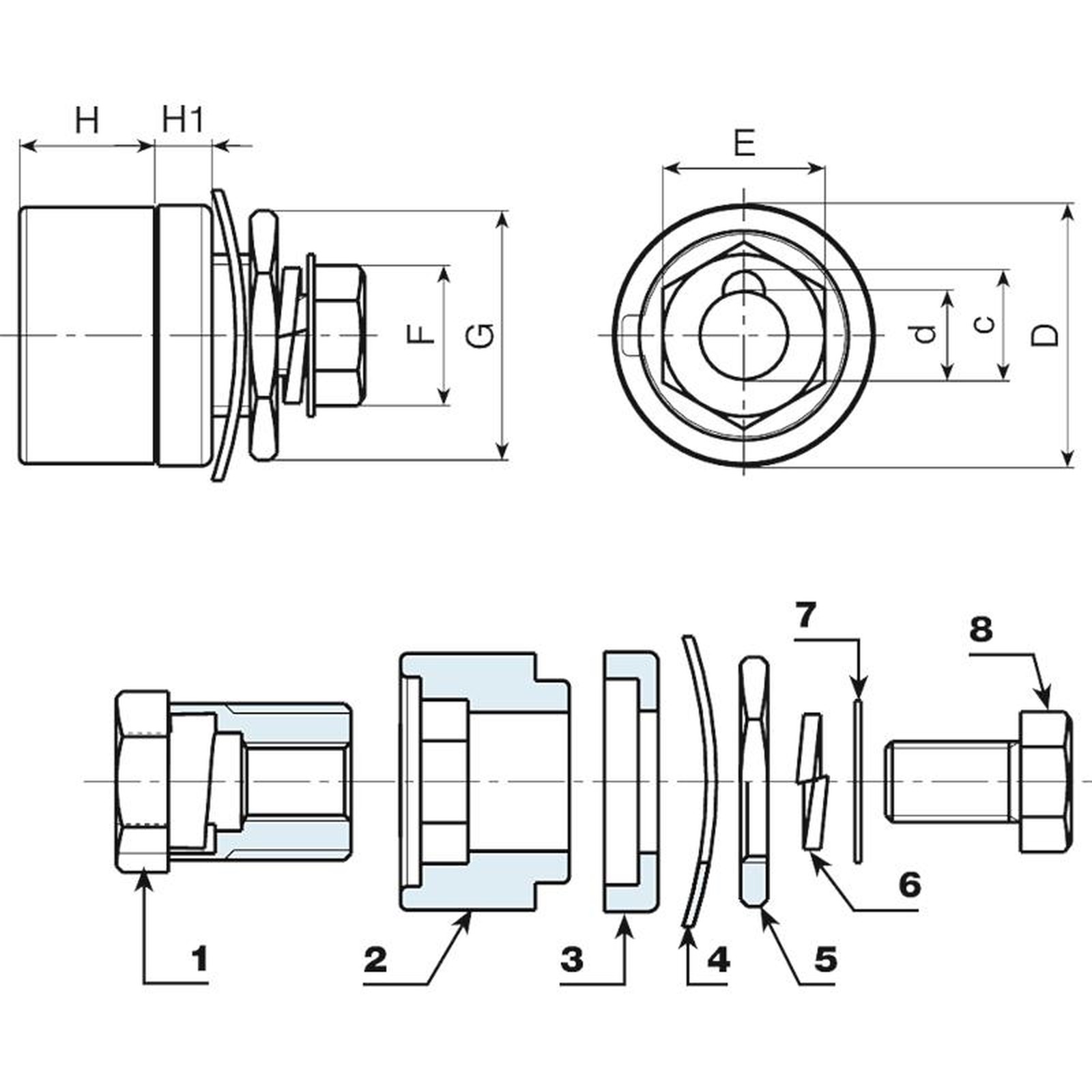 | Code | art. | D | H | H1 | d | c | E | F | G | Weight (g) | Amp. Max |