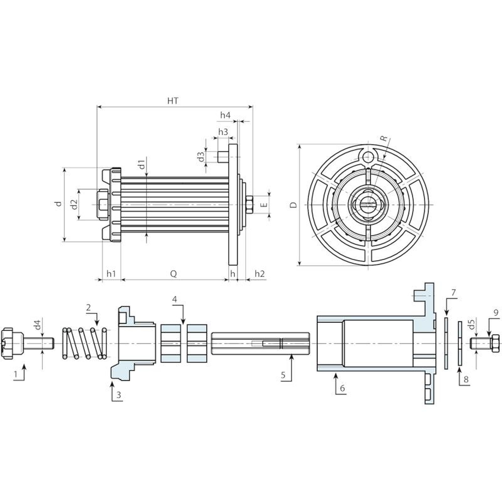 | Code | art. | D | HT | d | d1 | d2 | d3 | d4 | d5 | h | h1 | h2 | h3 | h4 | E | Q | R | Weight (g) |