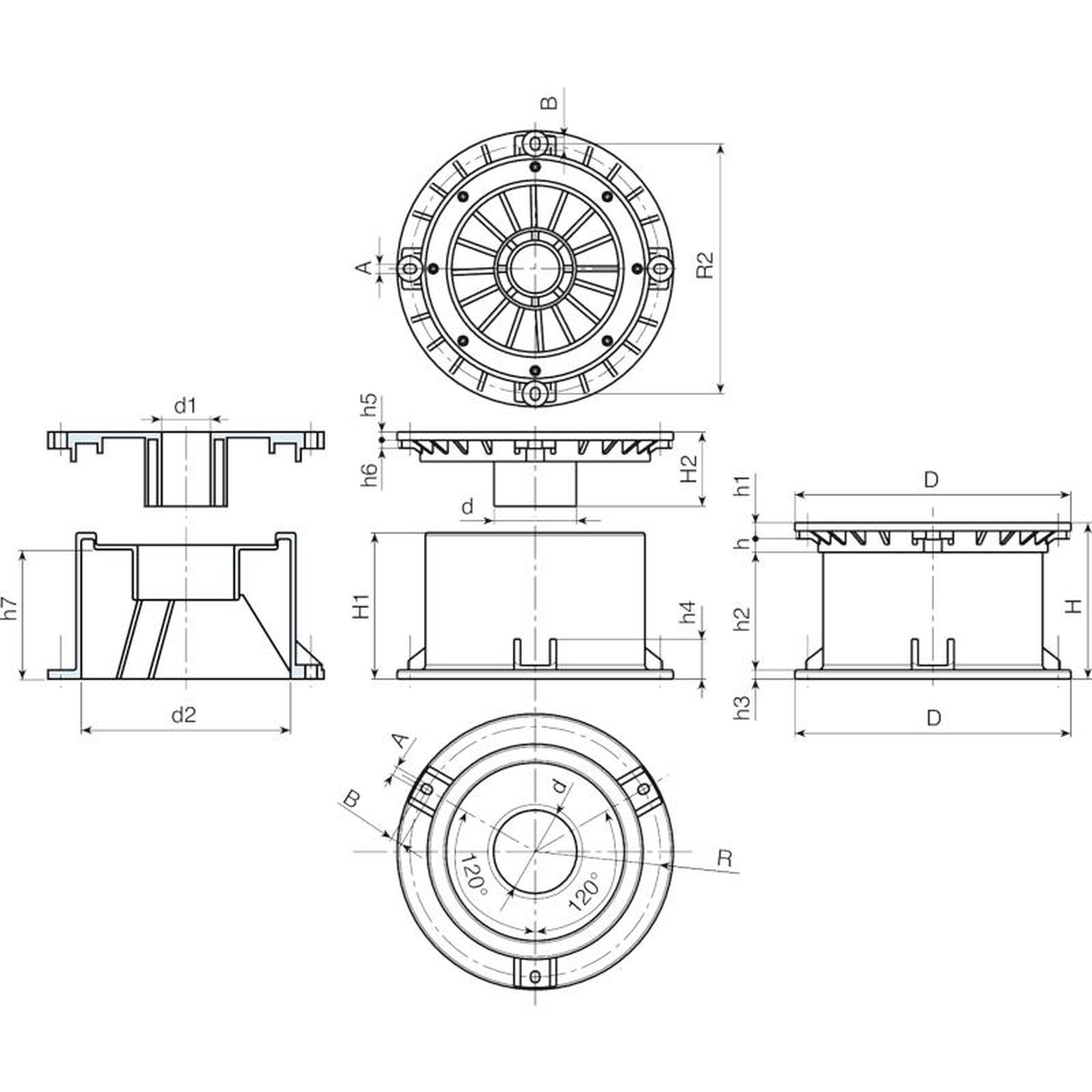 | Code | art. | D | H | H1 | H2 | d | d1 | d2 | h | h1 | h2 | h3 | h4 | h5 | h6 | h7 | R | R1 | A | B | Weight (g) |