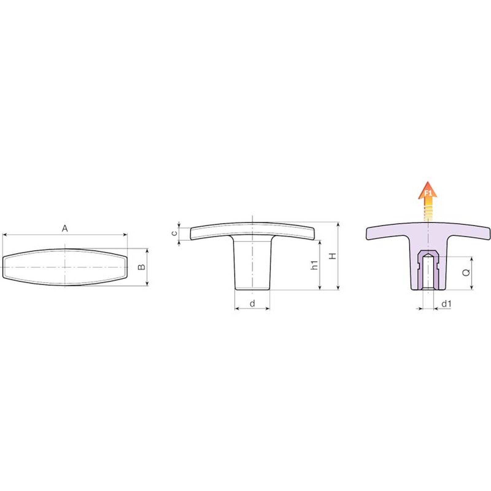 | Code | Art. | A | B | H | h1 | c | d | d1 H9 | Q | Weight (g) | F1 (N) |