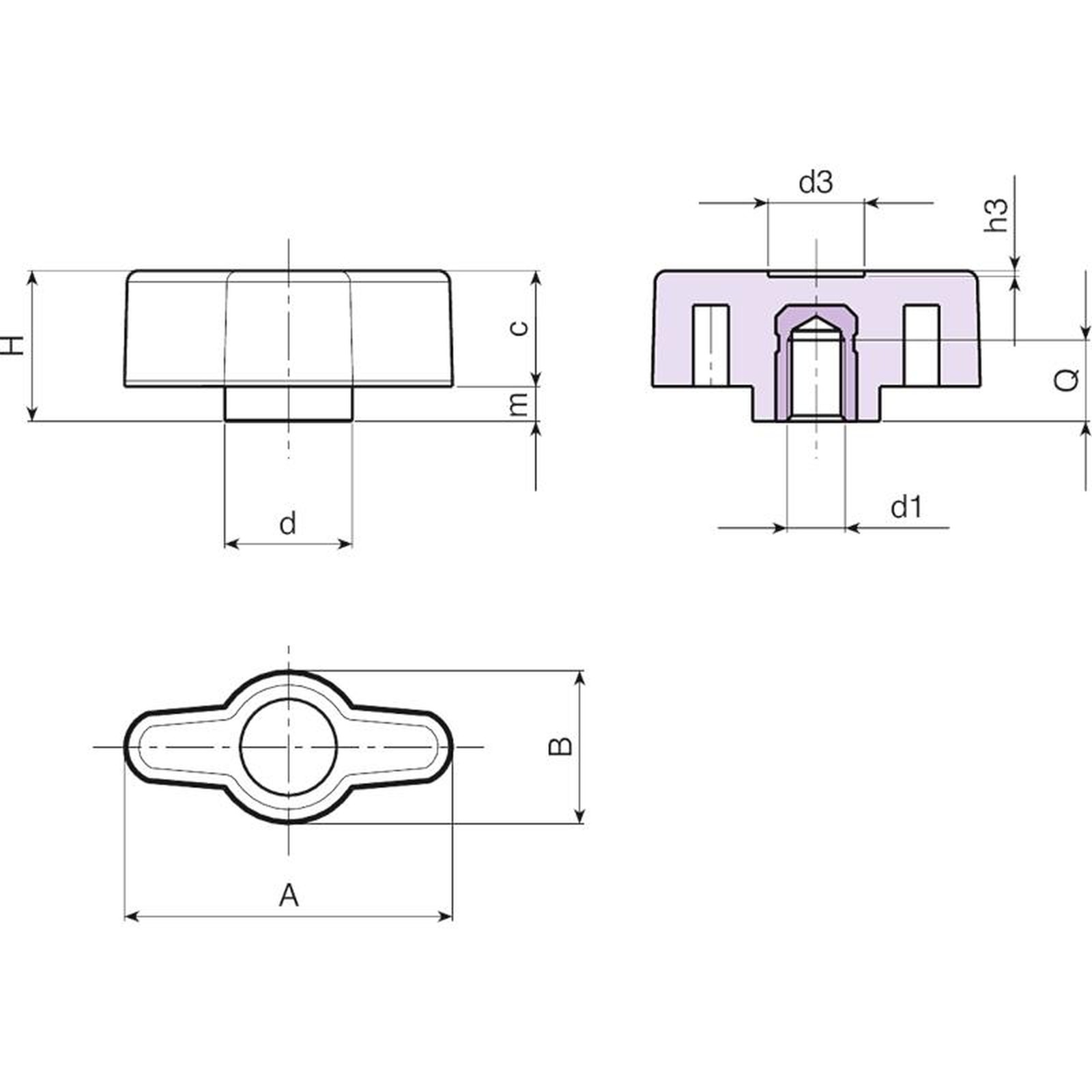 | Code | Art. | A | B | H | m | c | d | d3 | h3 | d1 6H | Q | Weight (g) |