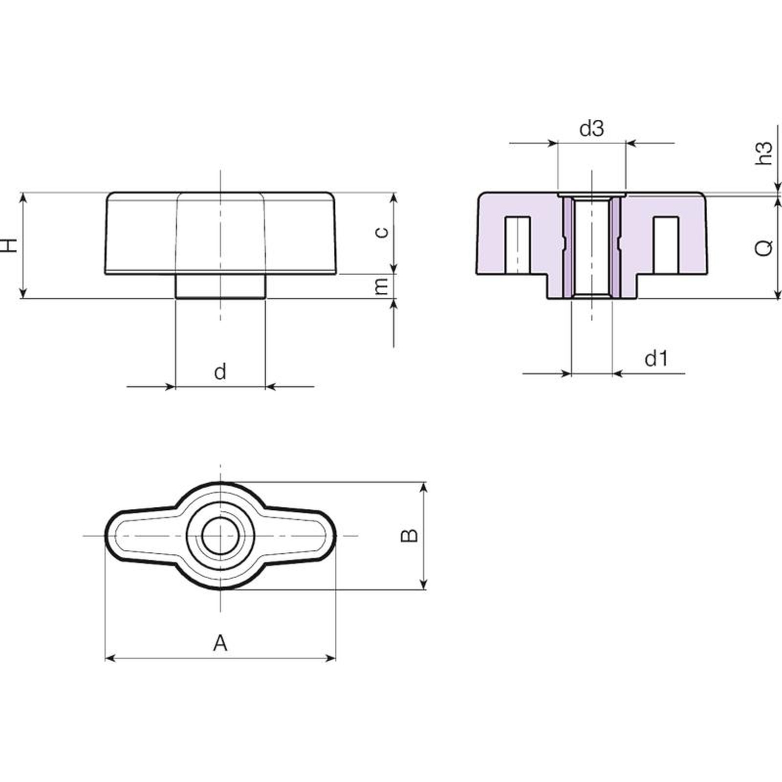 | Code | Art. | A | B | H | m | c | d | d3 | h3 | d1 6H | Q | Weight (g) |