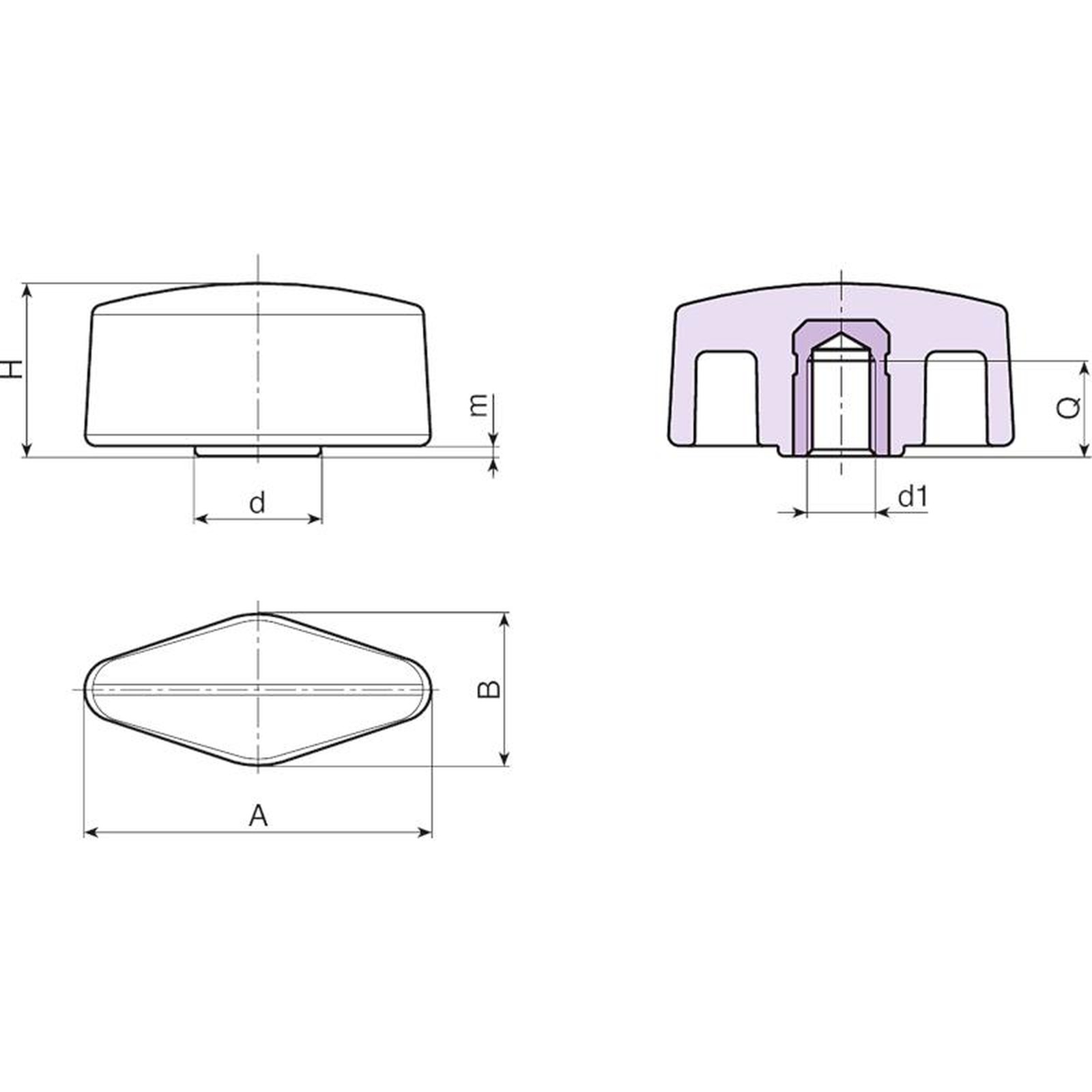 | Code | Art. | A | B | H | m | d | d1 6H | Q | Weight (g) |