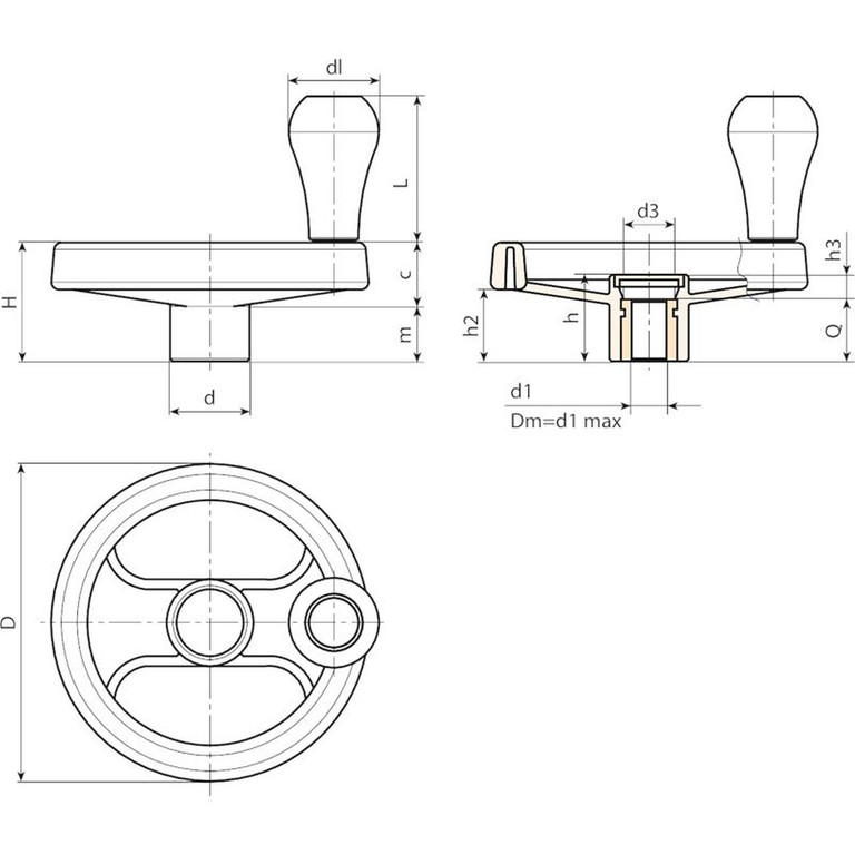 | Código | Art. | D | D2 | H | h | d | m | c | h2 | h3 | d3 | dl | L | Dm | d1 H10 | Q | Peso (g) |