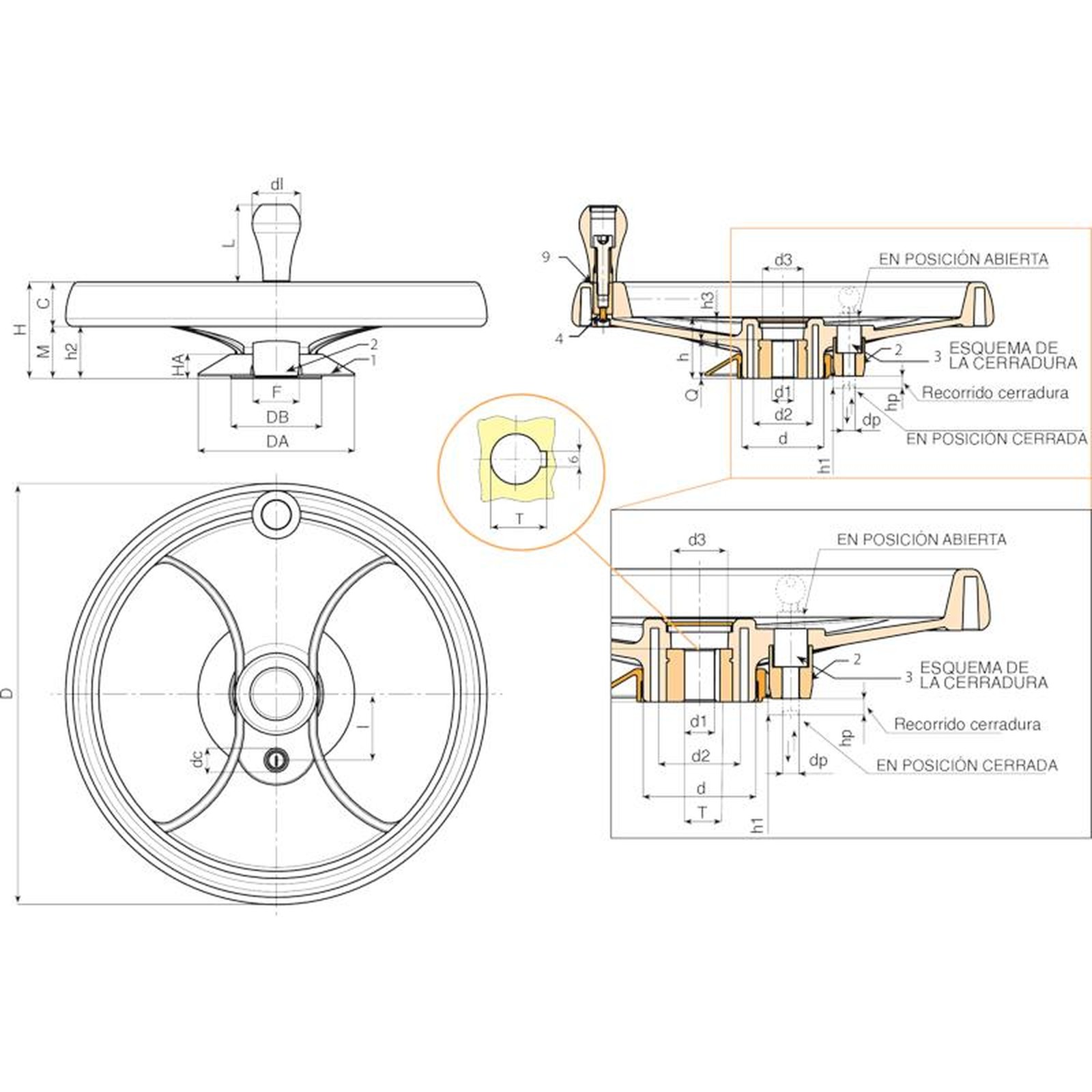 | Código | Art. | D | H | Ht | h | d | M | C | h2 | h3 | d2 | d3 | Dm | d1 H10 | T | Q | I | dc | h1 | dp | hp | DA | HA | DB | F | Peso (g) |