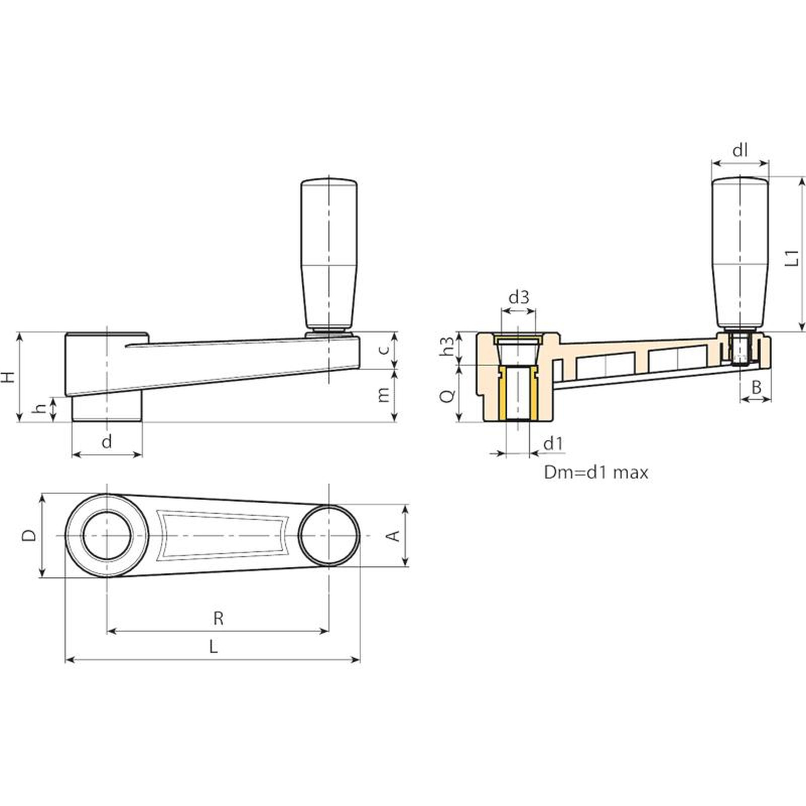 | Código | Art. | L | R | H | D | d | m | c | A | B | h | d3 | h3 | dm | d1 H10 | Q | dl | L1 | Peso (g) |