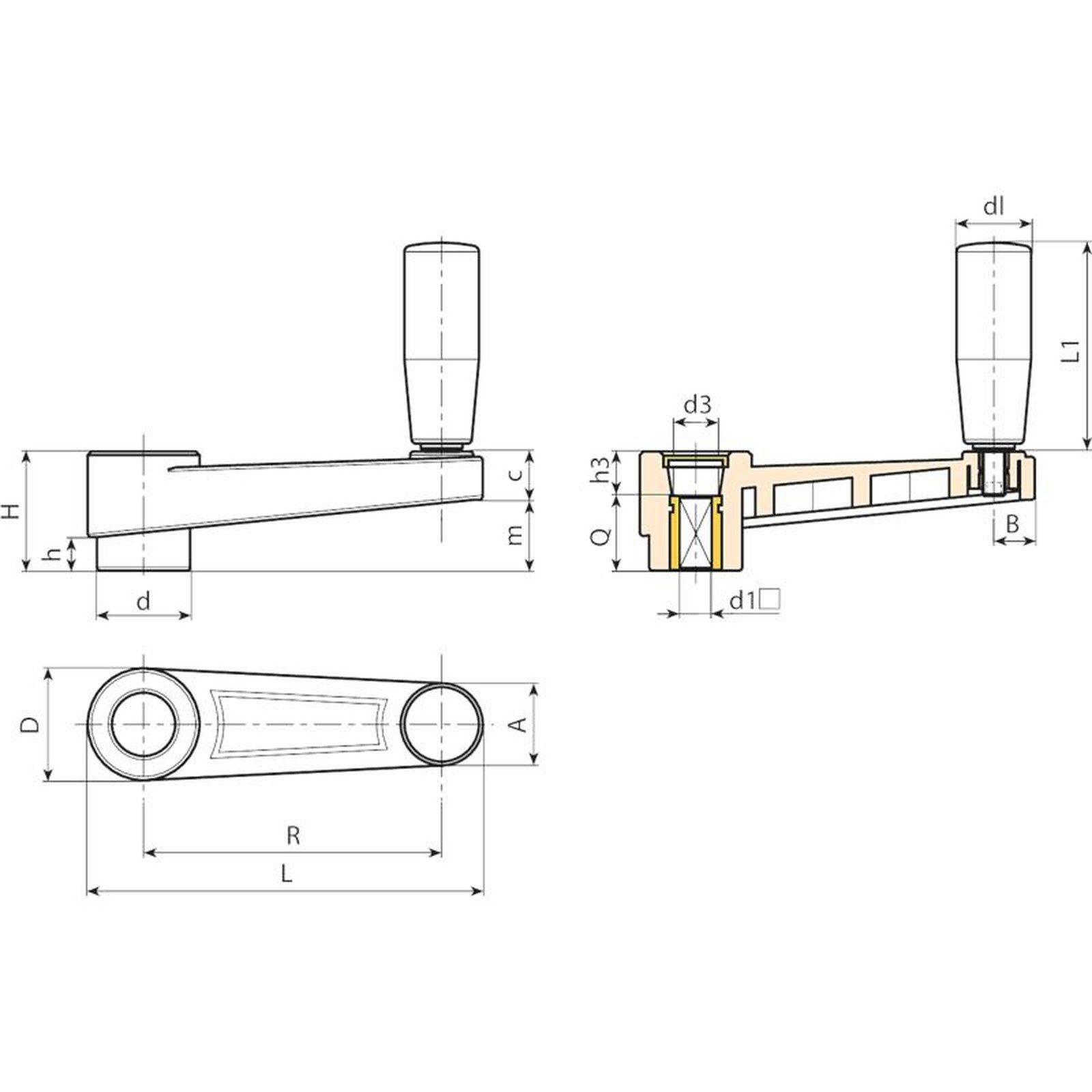 | Código | Art. | L | R | H | D | d | m | c | A | B | h | d3 | h3 | d1 H10 | Q | dl | L1 | Peso (g) |
