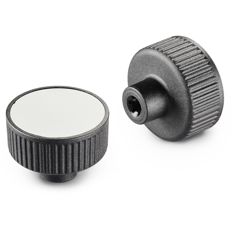 Tapón central de poliamida gris (RAL 7035 cód. 13) con anillo de soporte de poliamida negra para las versiones 57 y 94. Solo tapón sin anillo para la versión 72. Ensamblaje a presión. Desmontable.