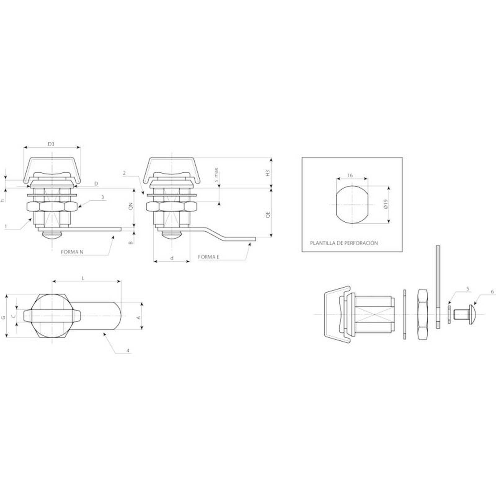 (4) Palanca de cierre de acero galvanizado. (Qn forma N recta - Qe forma E plegada externa).