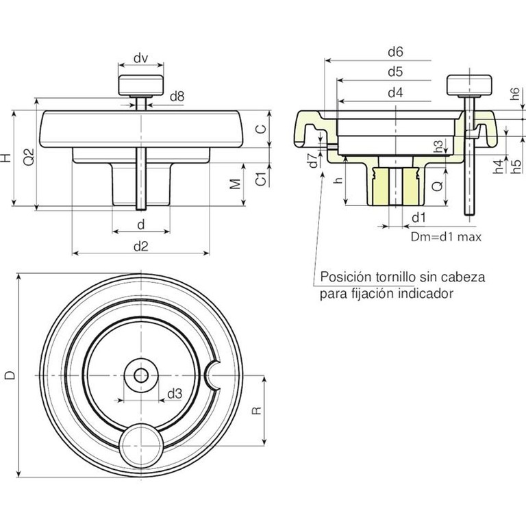 Código | art. | D | H | d | d2 | M | C | C1 | d3 | d4 | d5 | d6 | d7 | h | h3 | h4 | h5 | h6 | R | d8 | Dm | d1 | Q | Peso (g) |