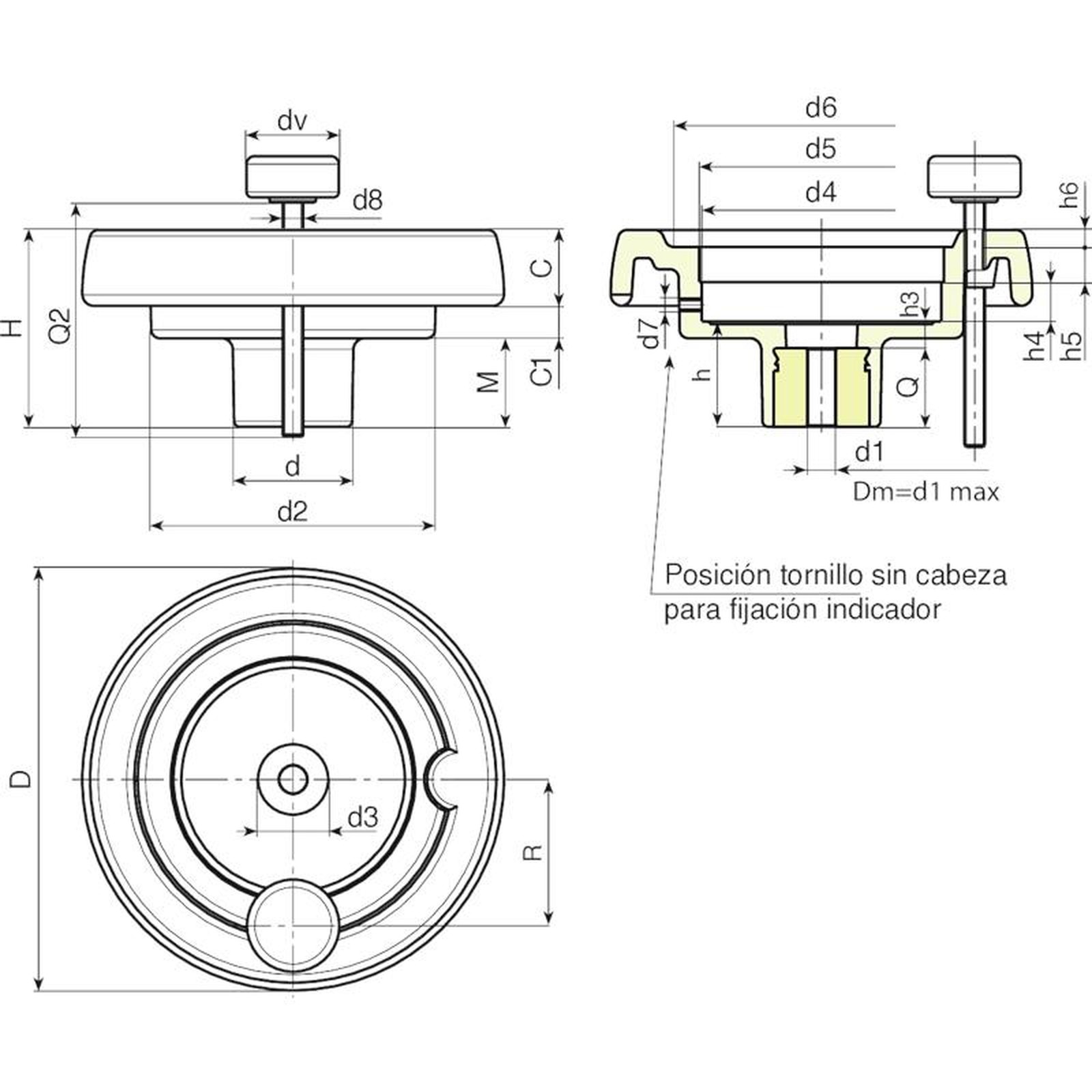 | Código | art. | D | H | d | d2 | M | C | C1 | d3 | d4 | d5 | d6 | d7 | h | h3 | h4 | h5 | h6 | R | d8 | Dm | d1 | Q | Peso (g) |