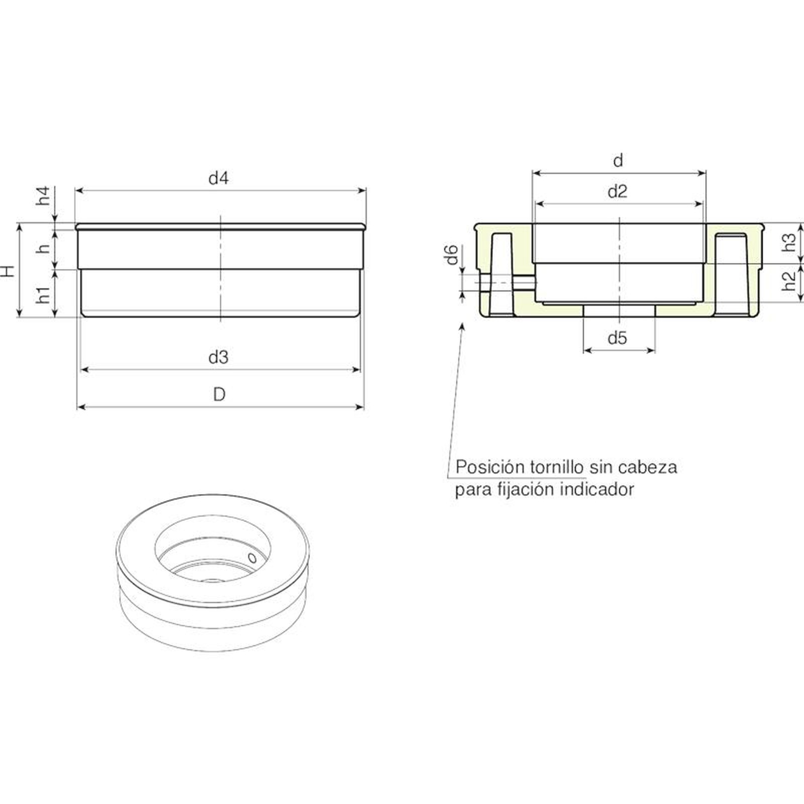 | Código | art. | D | d | d2 | d3 | d4 | d5 | d6 | H | h | h1 | h2 | h3 | h4 | Peso (g) |