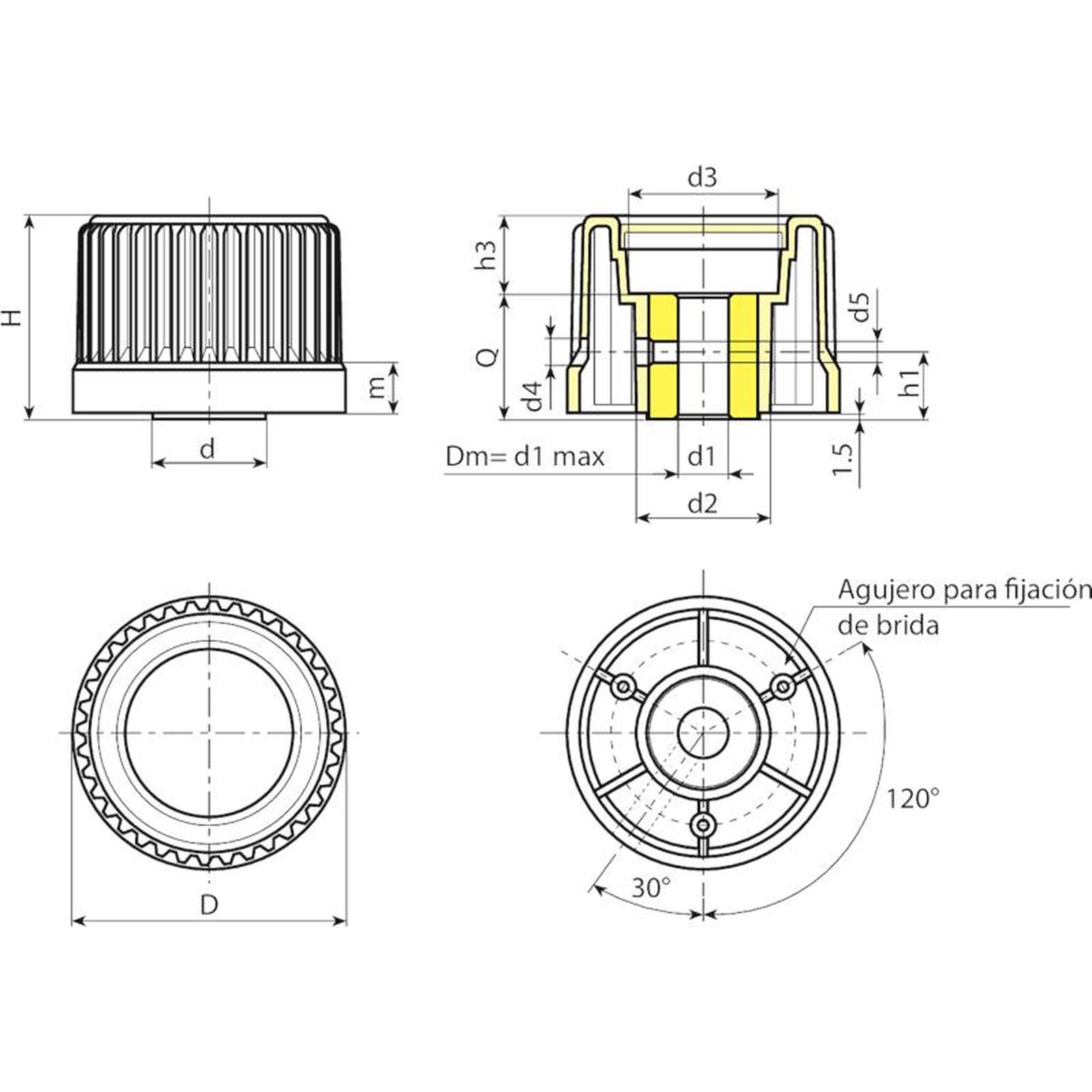 | Código | Art. | D | H | m | d | d2 | d3 | d4 | d5 | h1 | h3 | Dm | d1 H10 | Q | Peso (g) |
