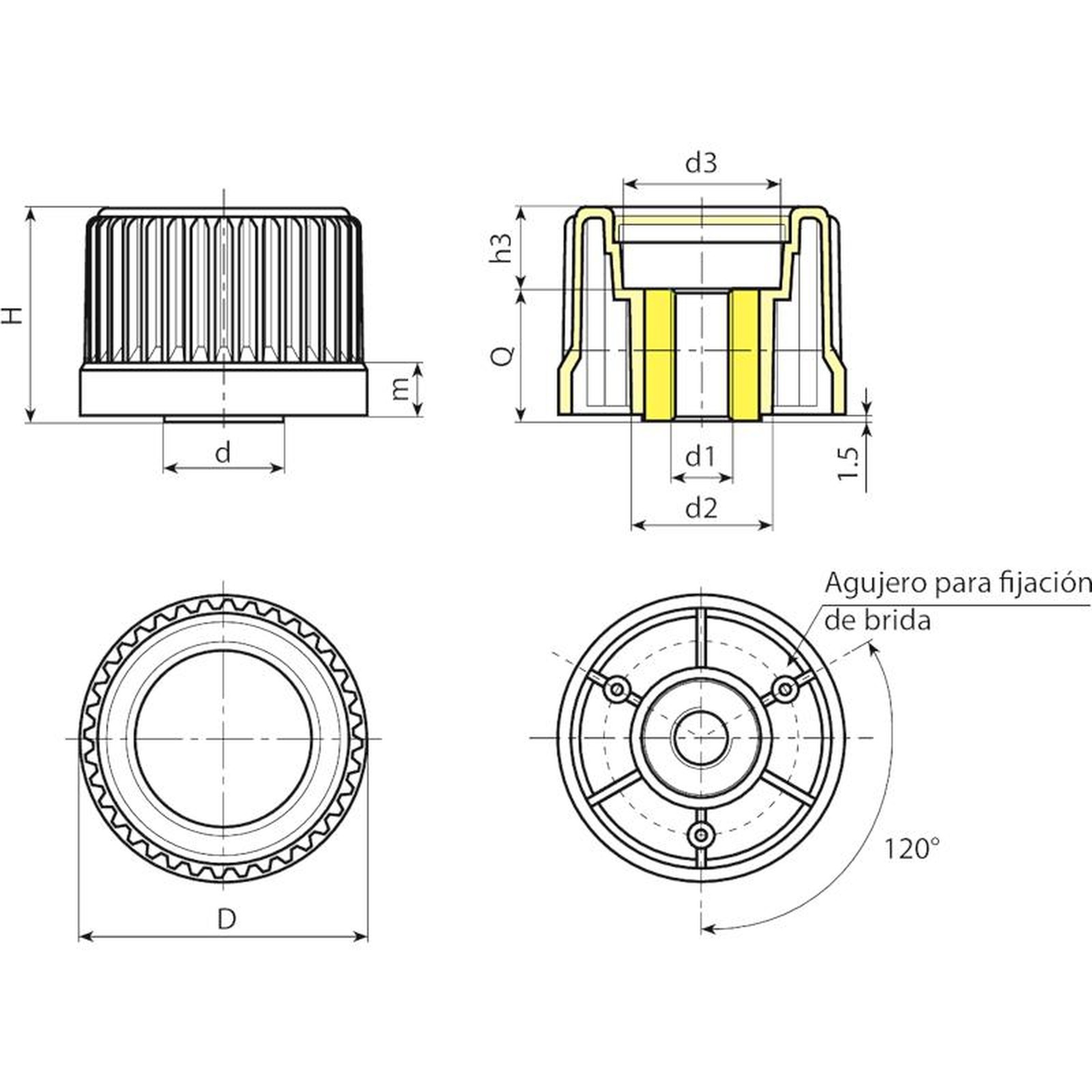 | Código | Art. | D | H | m | d | d2 | d3 | h3 | d1 6H | Q | Peso (g) |