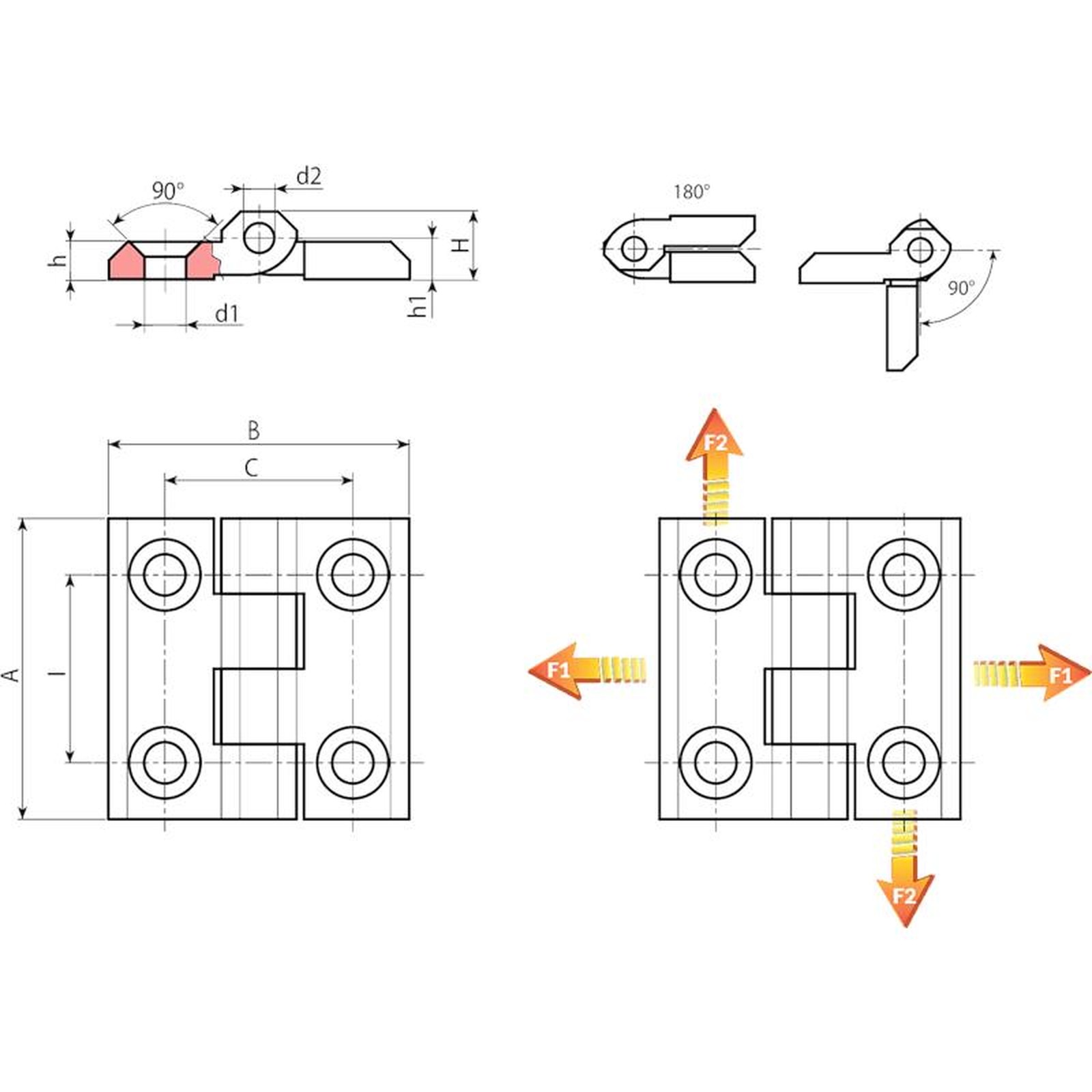 | Código | Art. | I | C | A | B | H | h | h1 | d2 | d1 | Peso (g) | F1 (N) | F2 (N) |
