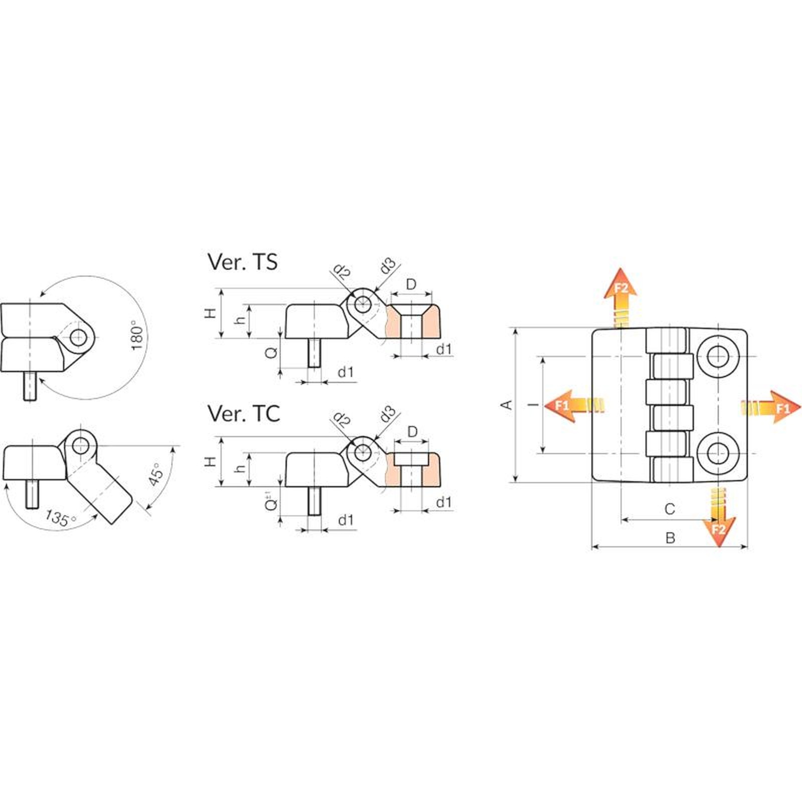| Código | art. | I | C | A | B | h | H | D | d2 | d3 | d1 | Q | Peso (g) | F1 (N) | F2 (N) |