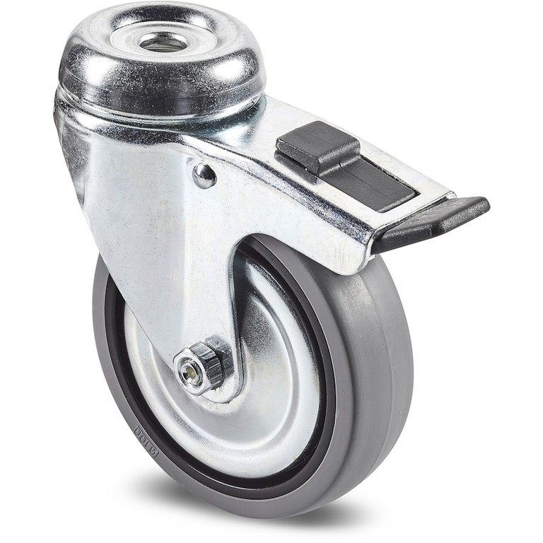 RUEDA DE POLIPROPILENO / GOMA CON SOPORTE GIRATORIO REDONDO DE ACERO Y ORIFICIO LISO PASANTE CON FRENO