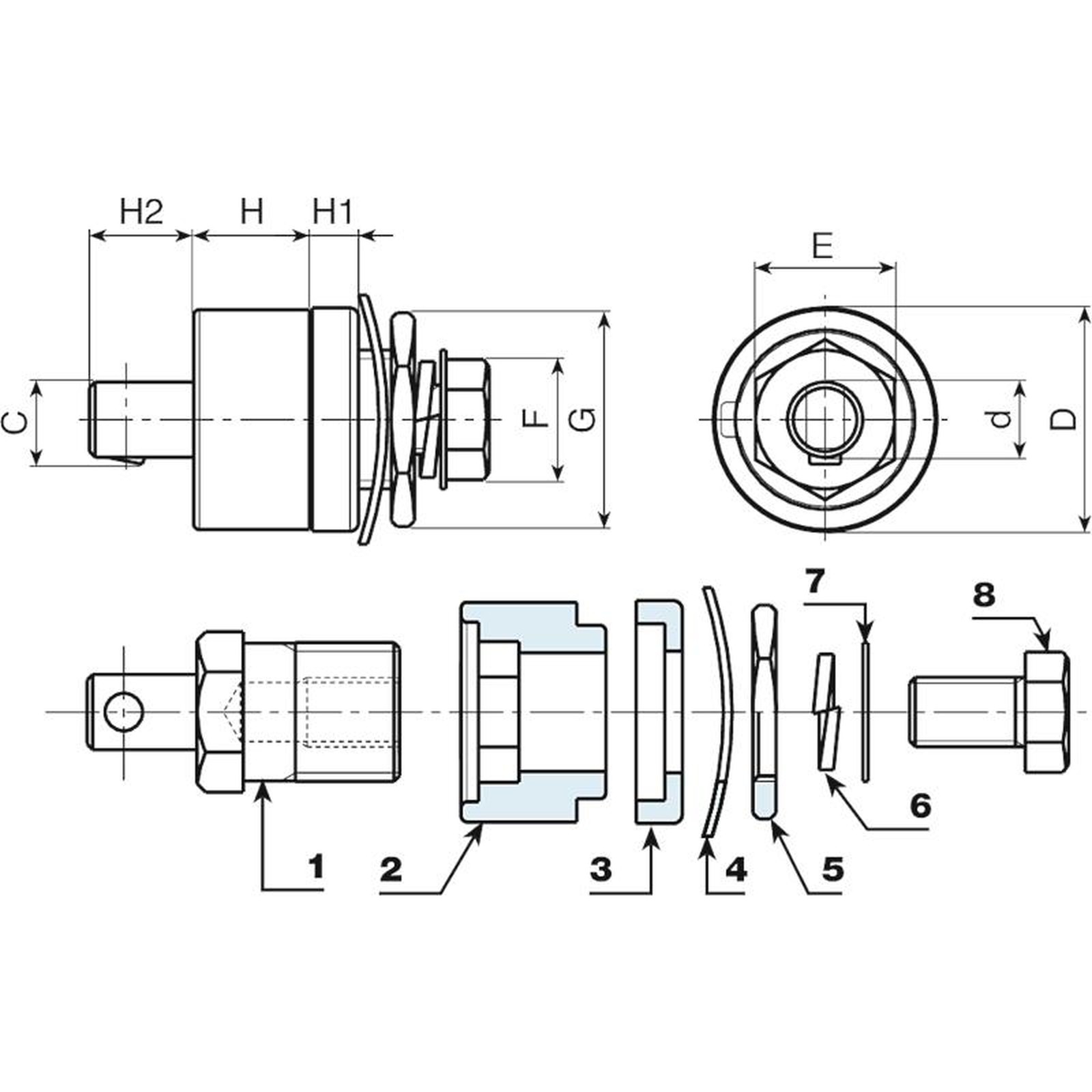 | Código | art. | D | H | H1 | H2 | d | c | E | F | G | Peso (g) | Amp. Max |