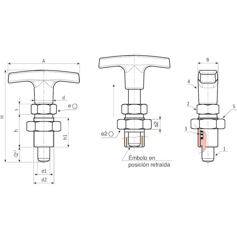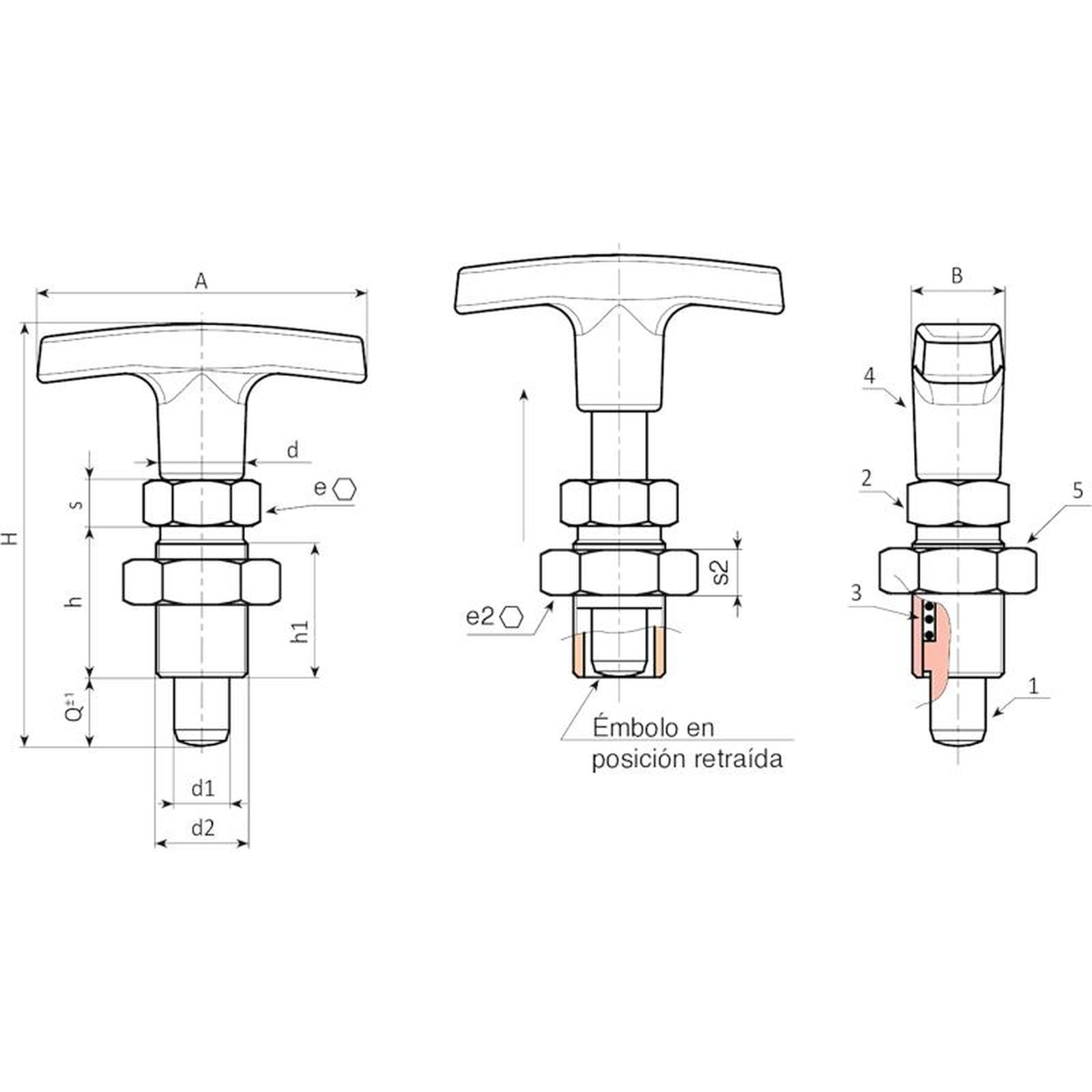 MANGOS EN T CON ÉMBOLO DE INDEXACIÓN ROSCADO DE ACERO CON TUERCA DE BLOQUEO