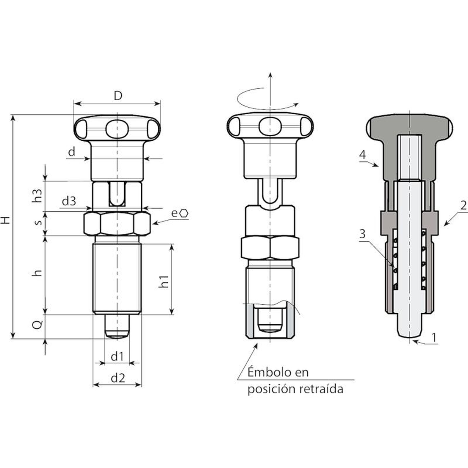 BOTÓN CON ÉMBOLO DE INDEXACIÓN ROSCADO DE ACERO INOXIDABLE INTEGRAL CON BLOQUEO