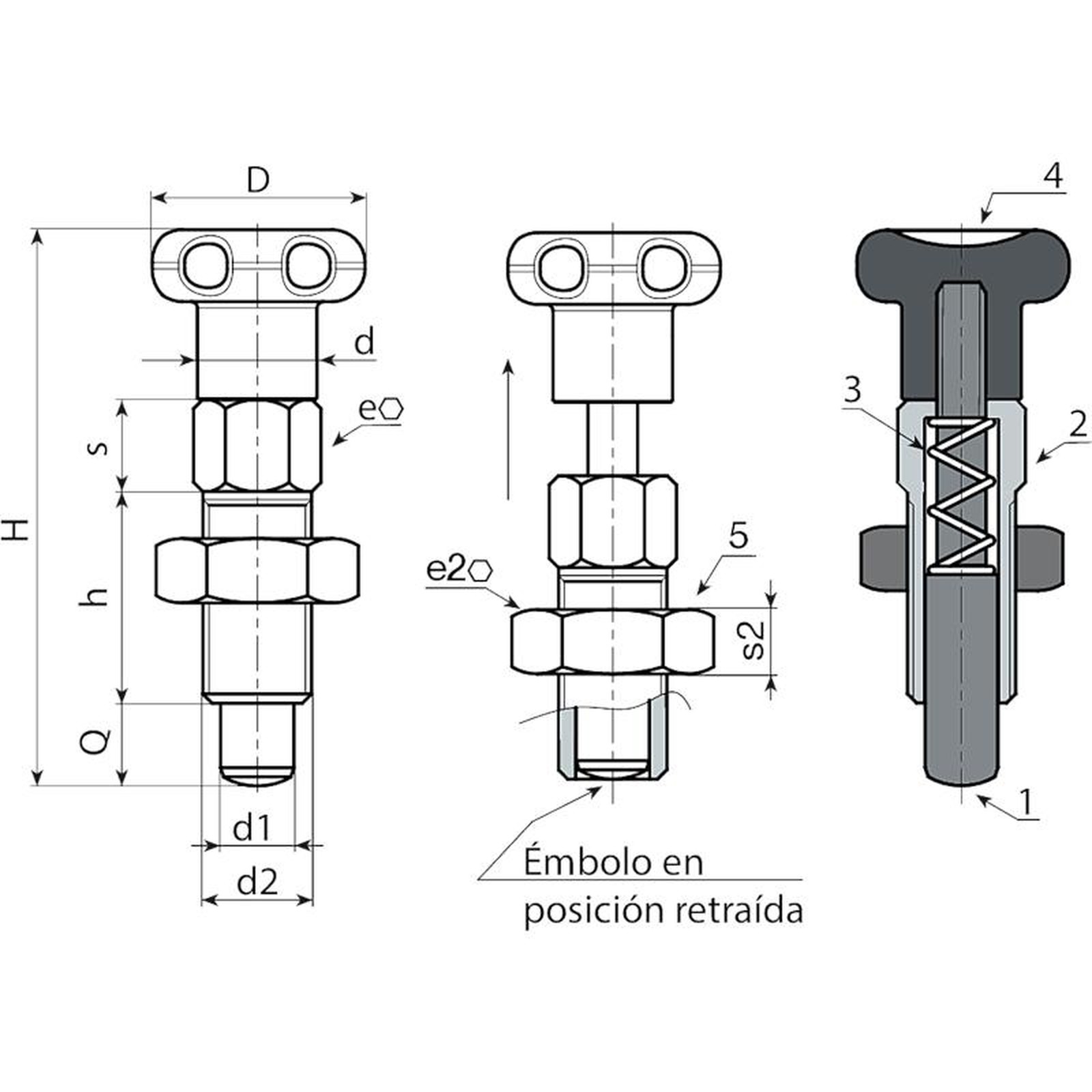 (2) Cuerpo émbolo de indexación roscado de acero inoxidable (AISI 303).