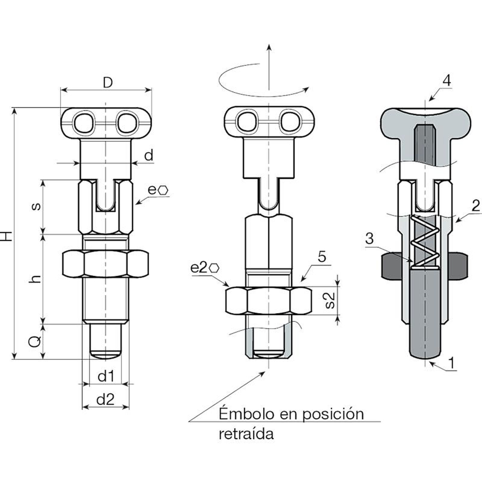 (2) Cuerpo émbolo de indexación roscado con bloqueo, de acero inoxidable (AISI 303).