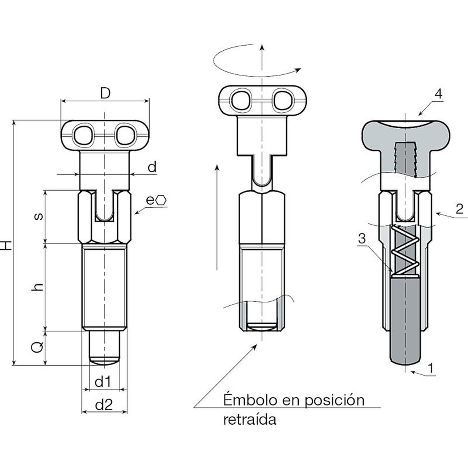 (2) Cuerpo émbolo de indexación roscado con bloqueo, de acero inoxidable (AISI 303).