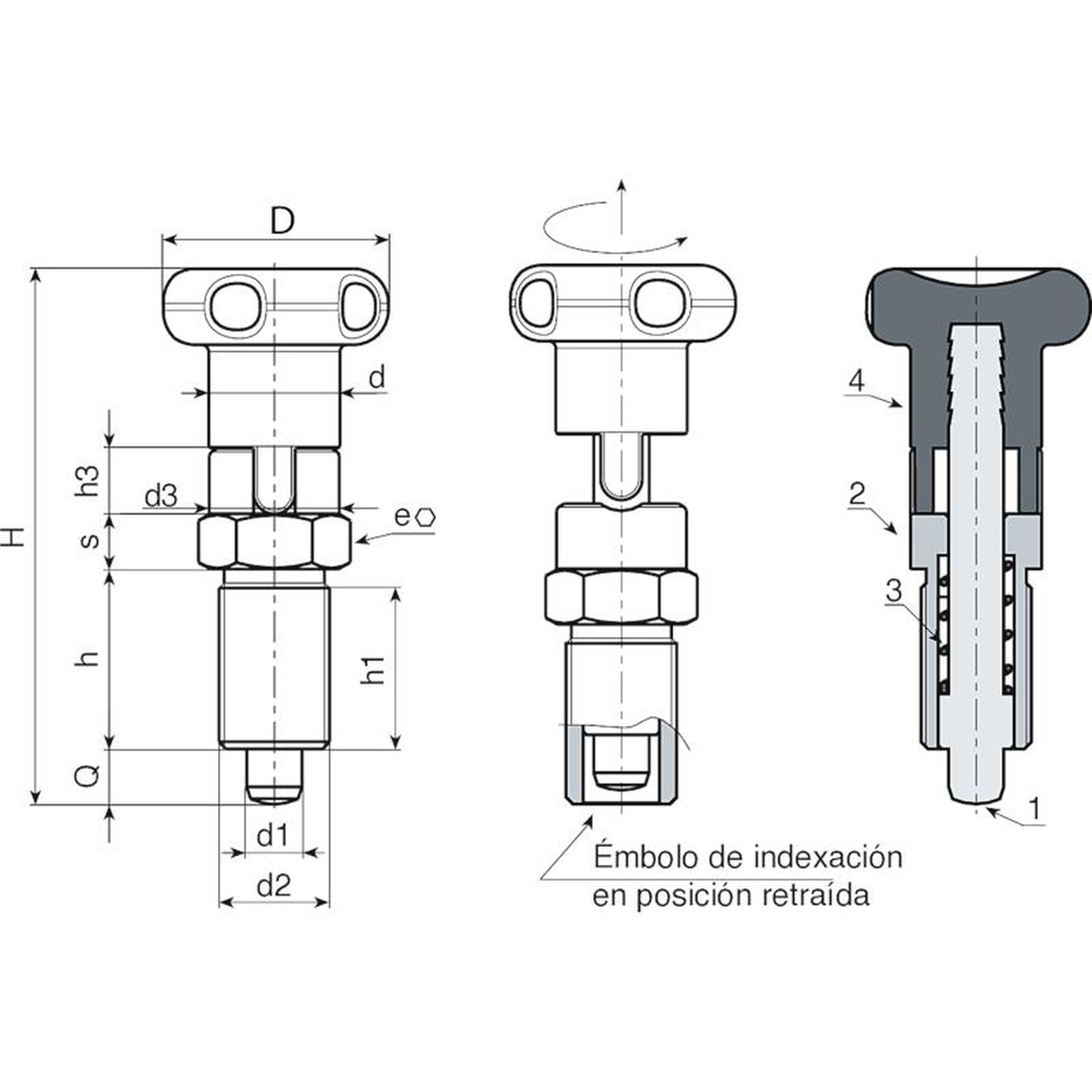 (1) Perno émbolo de indexación de acero inoxidable (AISI 303).