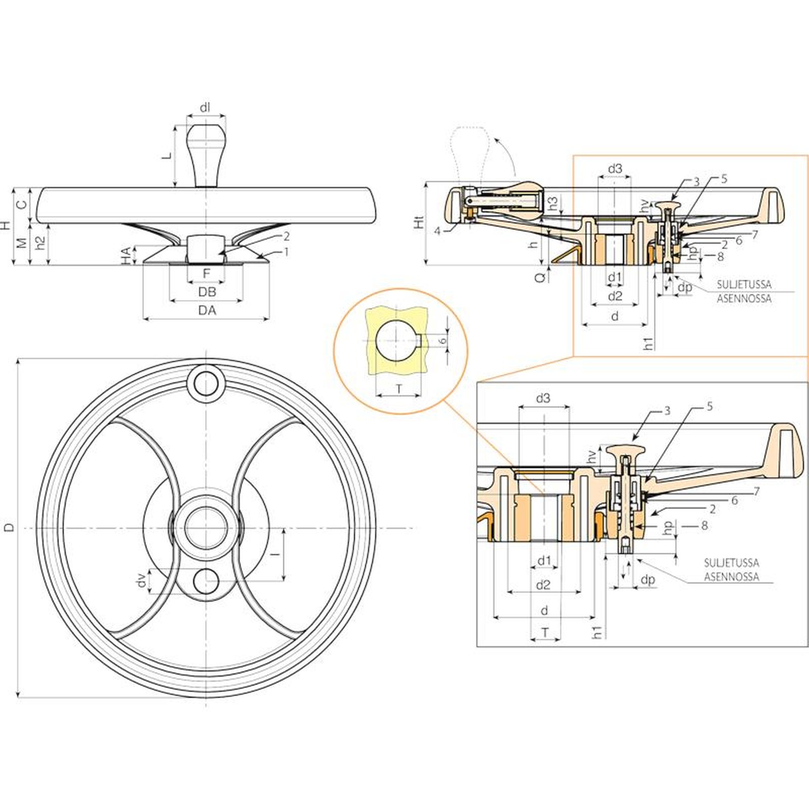 Kierrettävä ja käsipyörän sisään taittuva kahva, M202 “Euromodel”, kiinnitys kuusion muotoinen. Kahva PA6+GF-materiaalista, musta RAL 9011. Sisämekanismi mustattua terästä. Kiinnitys mustatulla kupukantaruuvilla, jossa upotettu kuusiokolo ISO 7838. Kahvan tulppa harmaata polyamidia (RAL 7035 koodi 13).