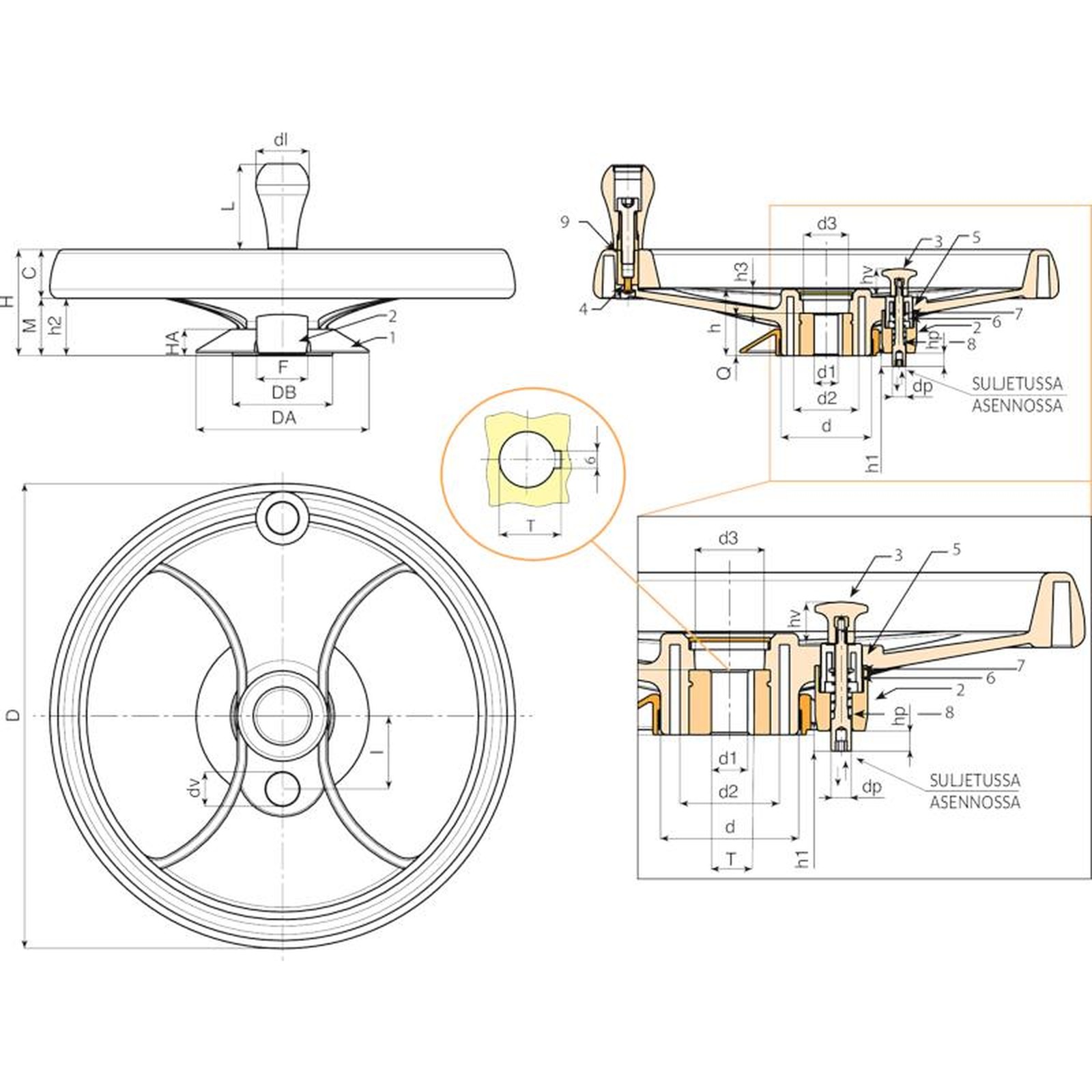 | Koodi | Art. | D | H | Ht | h | d | M | C | h2 | h3 | d2 | d3 | Dm | d1 H10 | T | Q | I | dv | hv | h1 | dp | hp | DA | HA | DB | F | Paino (g) |