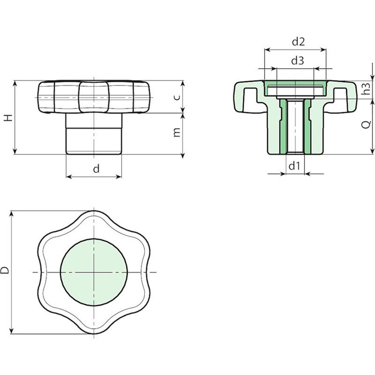 | Koodi | art. | D | H | d | c | m | d2 | d3 | h3 | d1 6H | Q | Paino (g) |