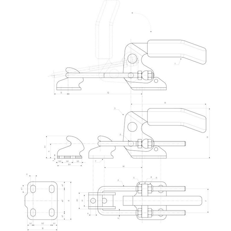 Koodi | Art. | F1 (kN) | R | H | S | Q | W | d | F | A | A1 | a1 | a2 | B | B1 | b1 | b2 | b3 | b4 | b5 | e | e1 | h | h1 | m | s | Paino (g) |