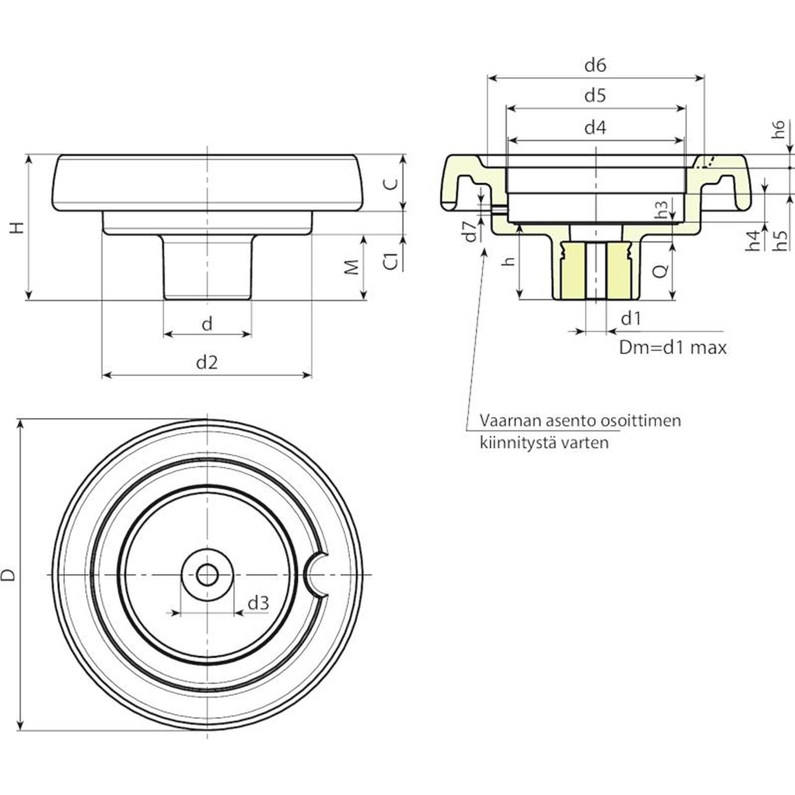| Koodi | art. | D | H | d | d2 | M | C | C1 | d3 | d4 | d5 | d6 | d7 | h | h3 | h4 | h5 | h6 | Dm | d1 | Q | Paino (g) |