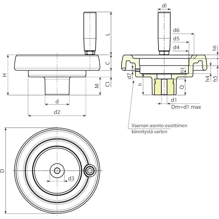 | Koodi | art. | D | H | d | d2 | M | C | C1 | d3 | d4 | d5 | d6 | d7 | h | h3 | h4 | h5 | h6 | dl | L | Dm | d1 | Q | Paino (g) |