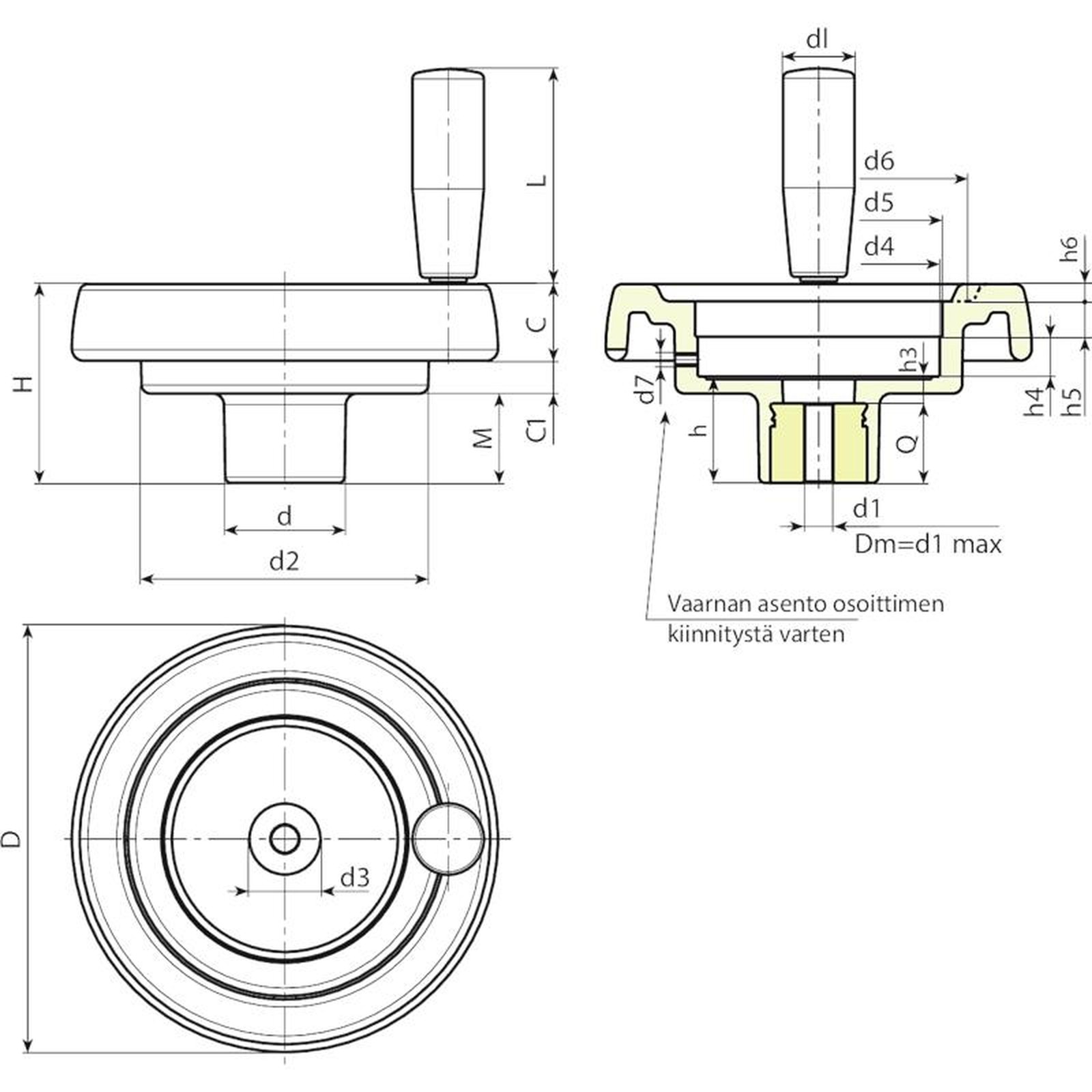 | Koodi | art. | D | H | d | d2 | M | C | C1 | d3 | d4 | d5 | d6 | d7 | h | h3 | h4 | h5 | h6 | dl | L | Dm | d1 | Q | Paino (g) |