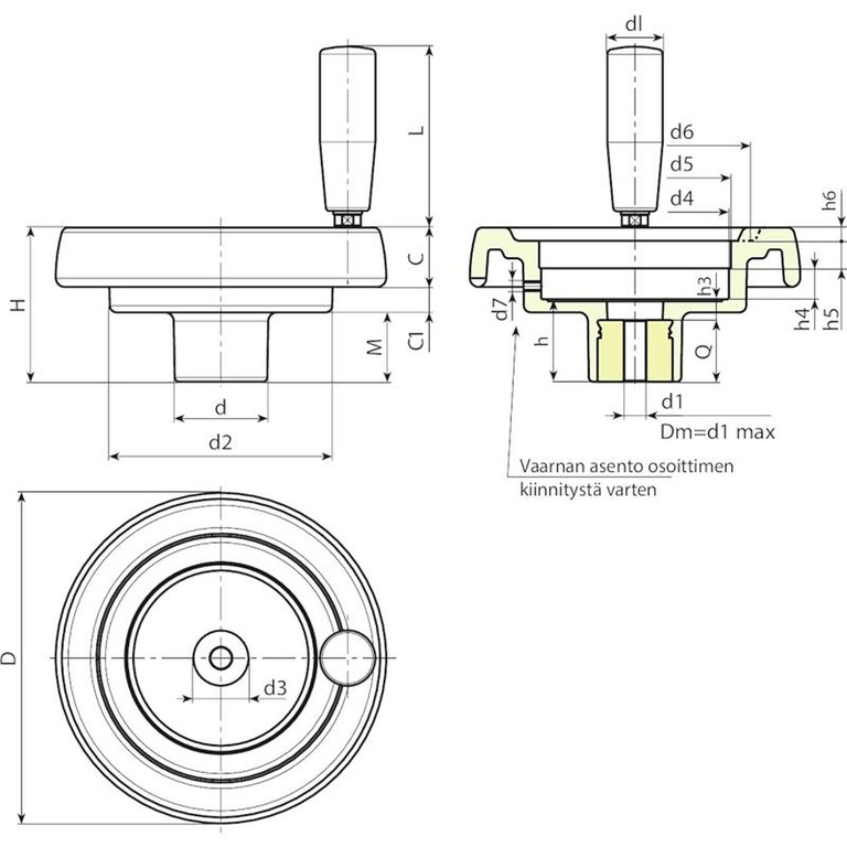 | Koodi | art. | D | H | d | d2 | M | C | C1 | d3 | d4 | d5 | d6 | d7 | h | h3 | h4 | h5 | h6 | dl | L | Dm | d1 | Q | Paino (g) |