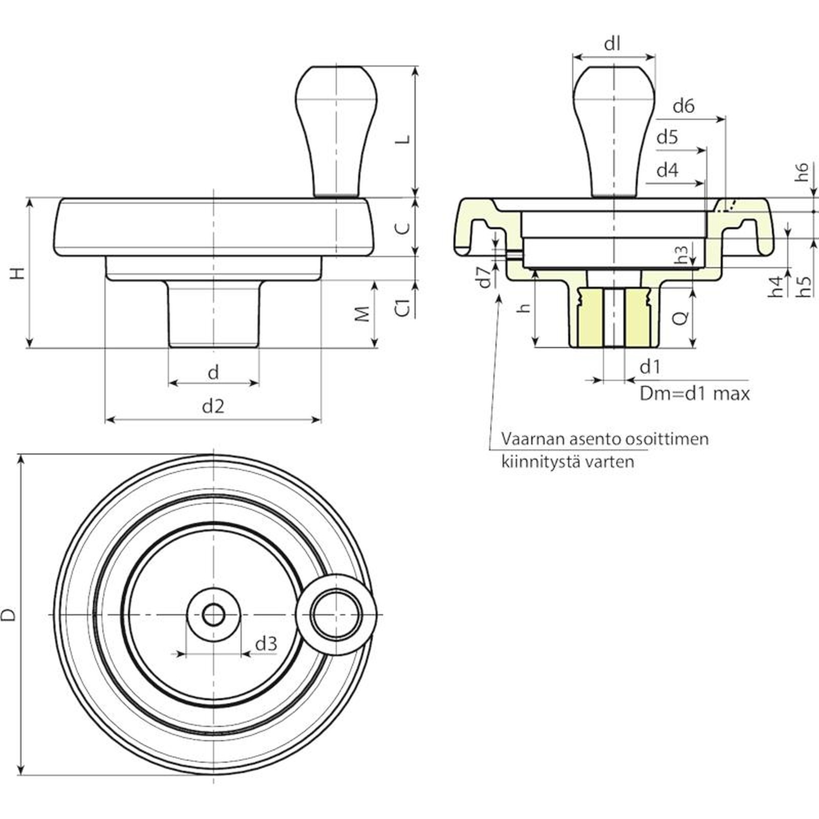 | Koodi | art. | D | H | d | d2 | M | C | C1 | d3 | d4 | d5 | d6 | d7 | h | h3 | h4 | h5 | h6 | dl | L | Dm | d1 | Q | Paino (g) |