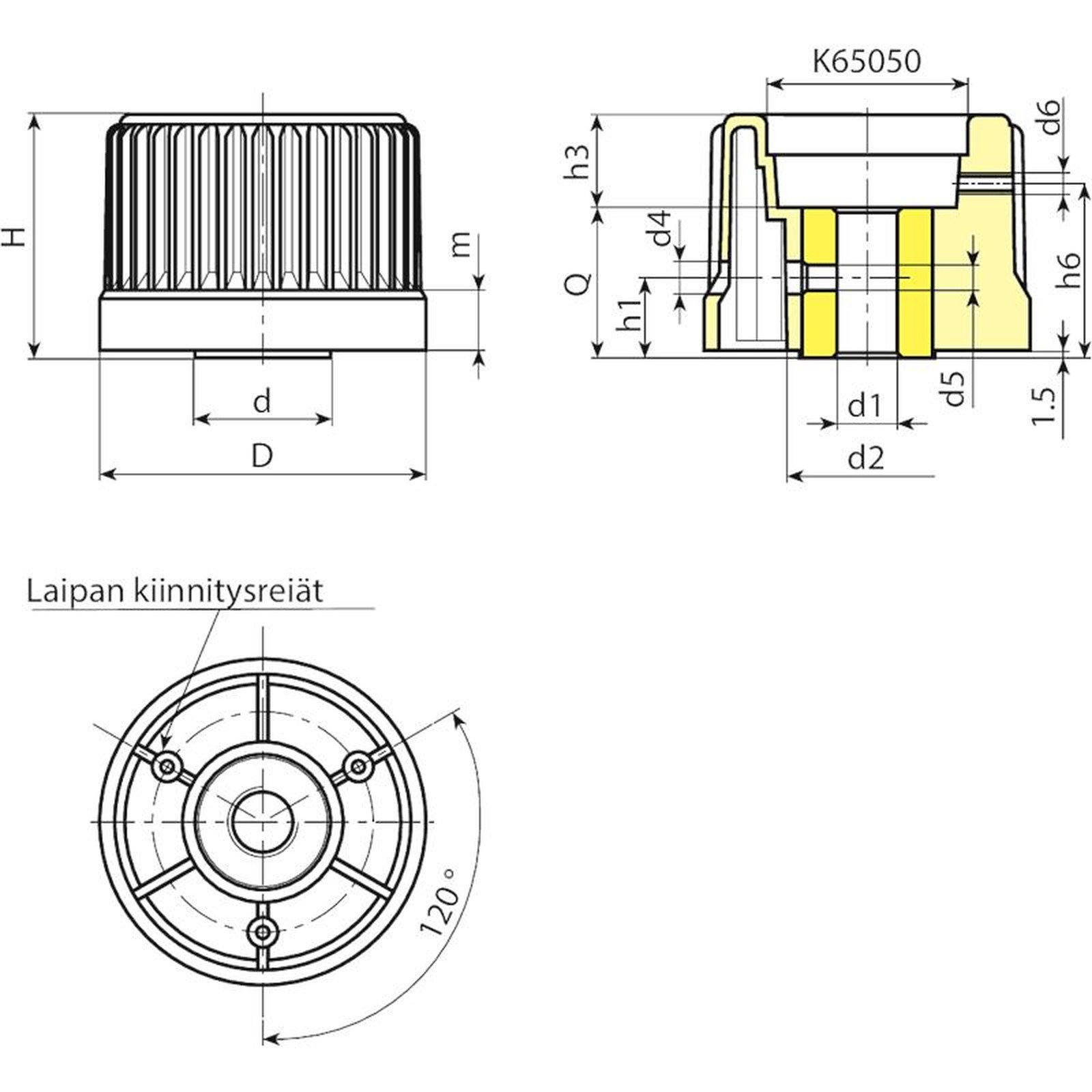 | Koodi | art. | D | H | m | d | d2 | d4 | d5 | d6 | h1 | h3 | h6 | Dm | d1 H10 | Q | Paino (g) |