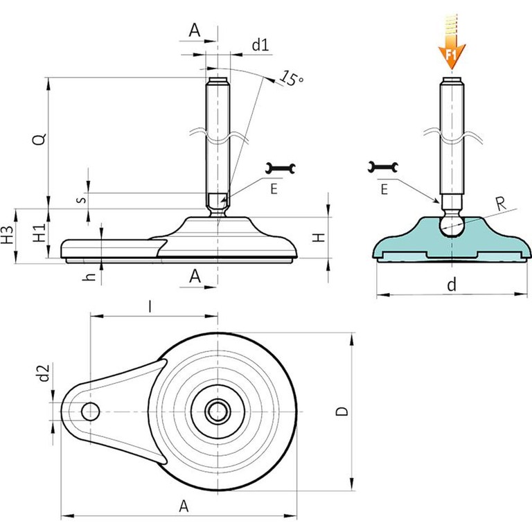| Koodi | Art. | D | H | I | H1 | H3 | h | A | E | s | d2 | d | R | d1 6g | Q | Paino (g) | F1 (kN) |