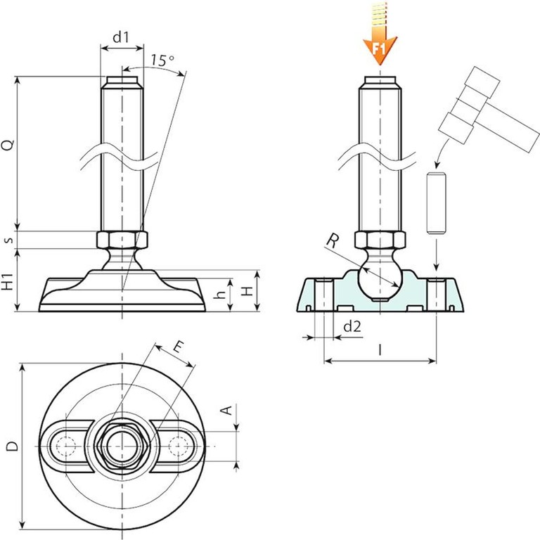 | Koodi | Art. | D | H | I | H1 | h | A | E | s | d2 | R | d1 6g | Q | Paino (g) | F1 (kN) |