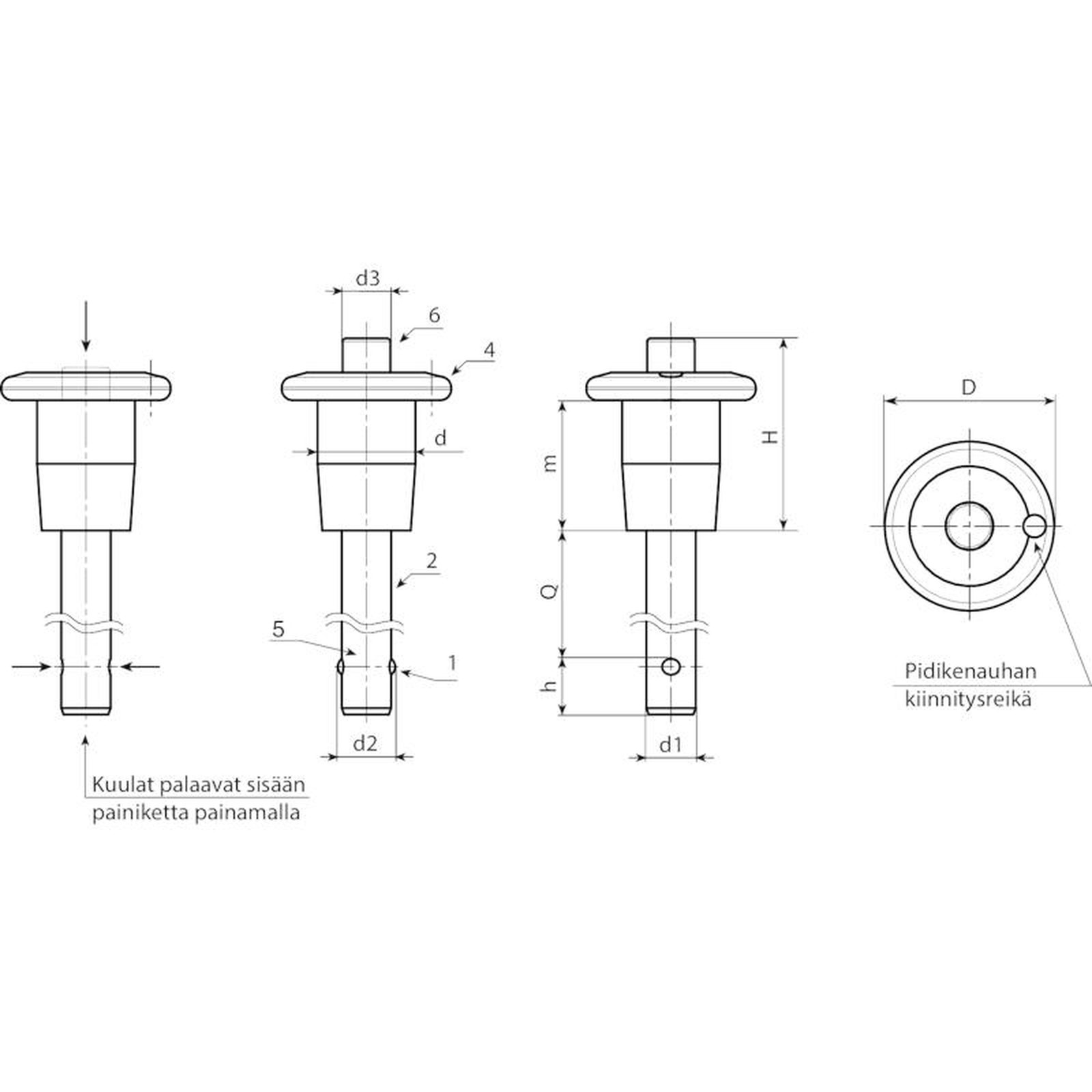 | Koodi | Art. | D | H | m | d | d2 (±0.25) | d3 | d1 (-0,04 -0,08) | Q (+0.5) | h (±1) | Paino (g) |
