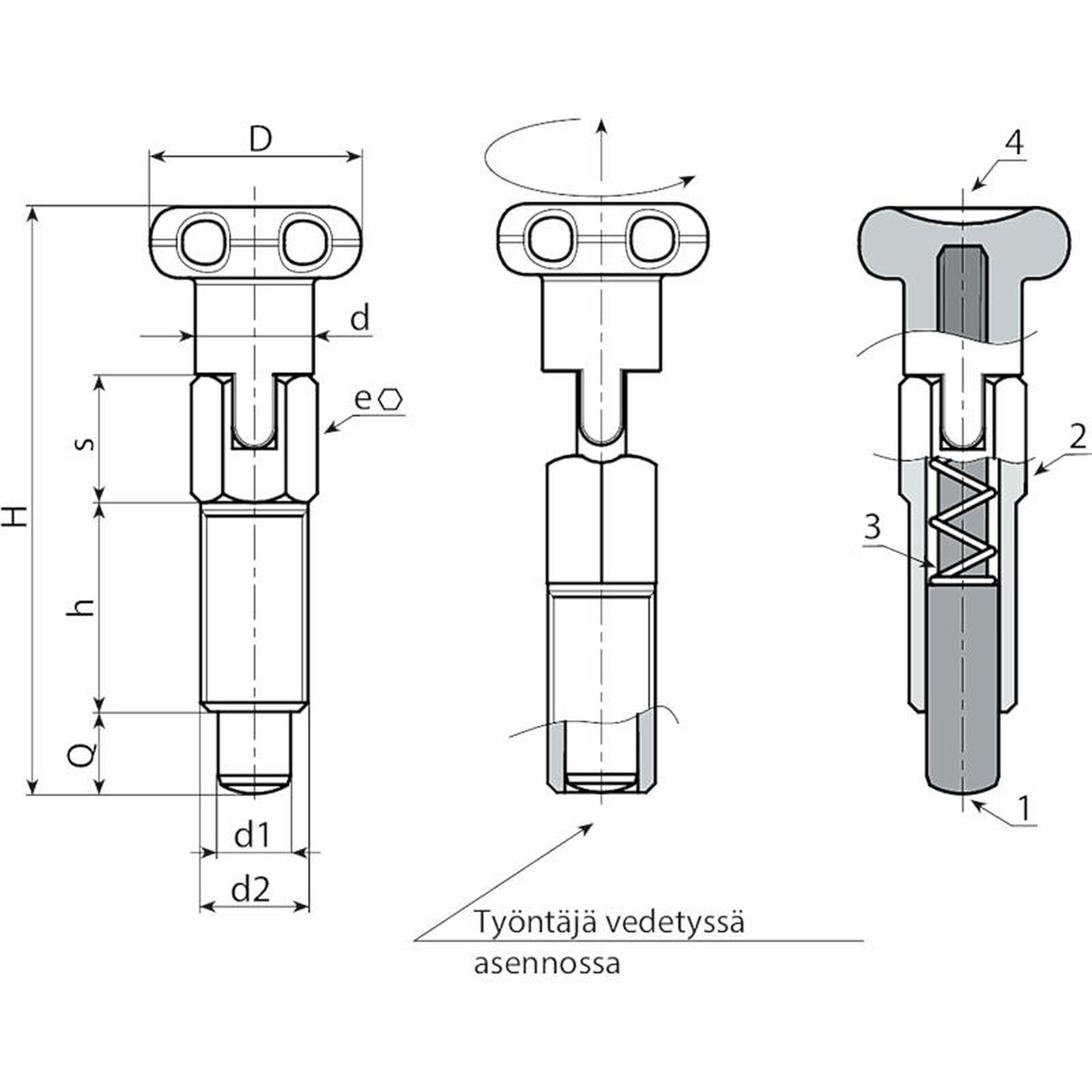 (2) Lukitustapin runko kierteitetty, mukana lukitus, ruostumatonta terästä (AISI 303).