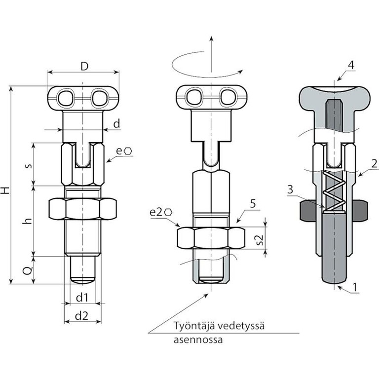 (2) Lukitustapin runko kierteitetty, mukana lukitus, ruostumatonta terästä (AISI 303).