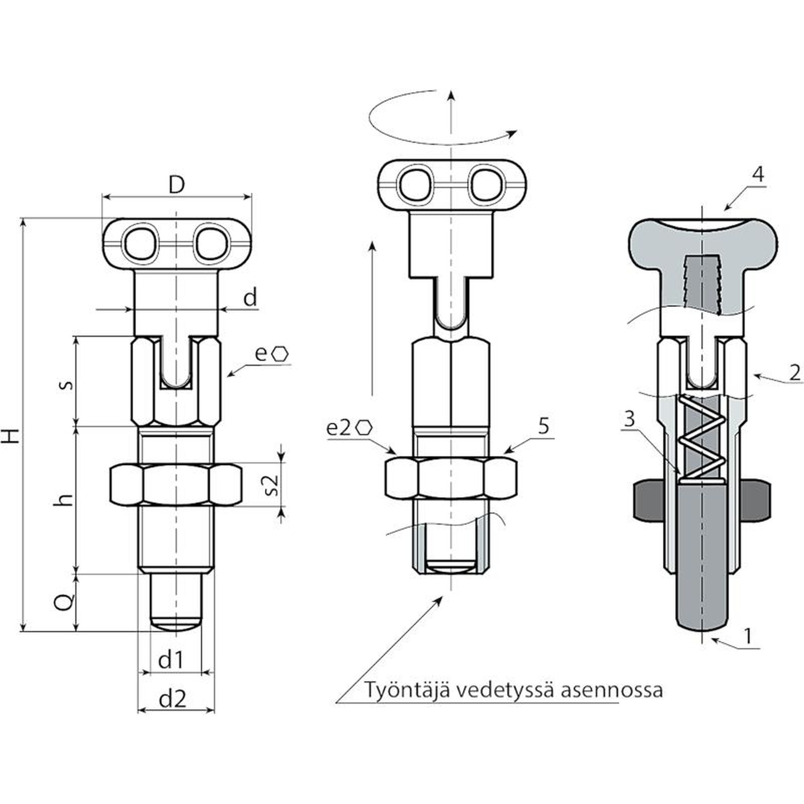 (2) Lukitustapin runko kierteitetty, mukana lukitus, ruostumatonta terästä (AISI 303).