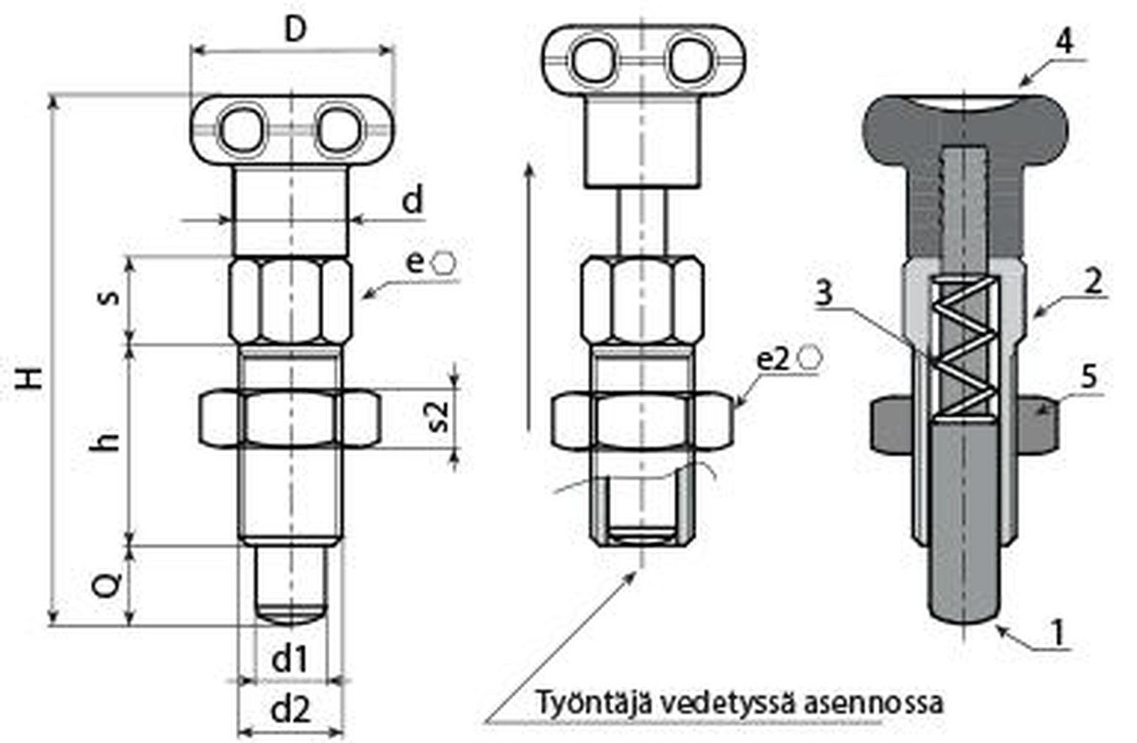 (2) Lukitustapin runko kierteitetty, automaattiterästä.