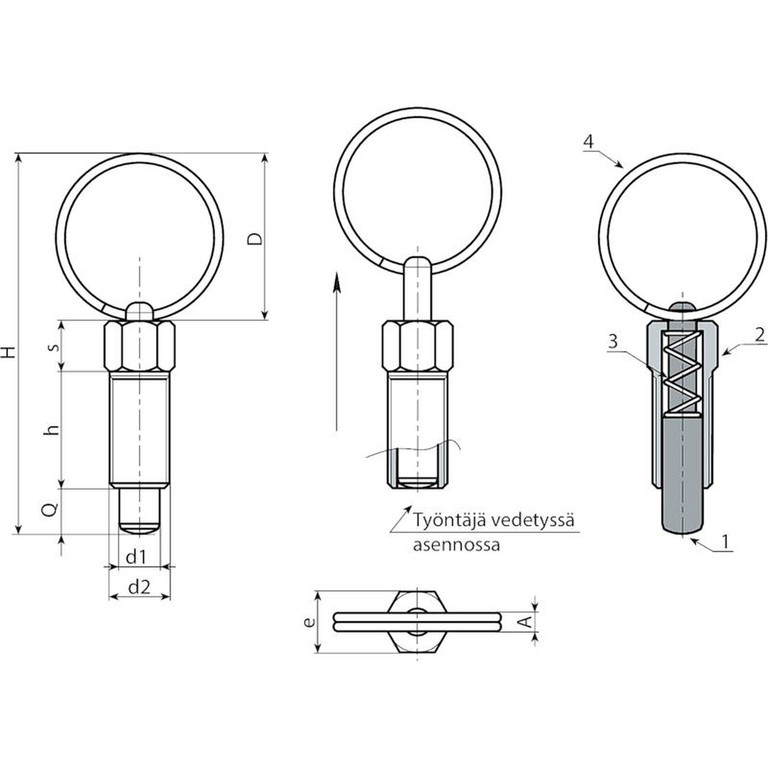 (2) Lukitustapin runko kierteitetty, automaattiterästä.