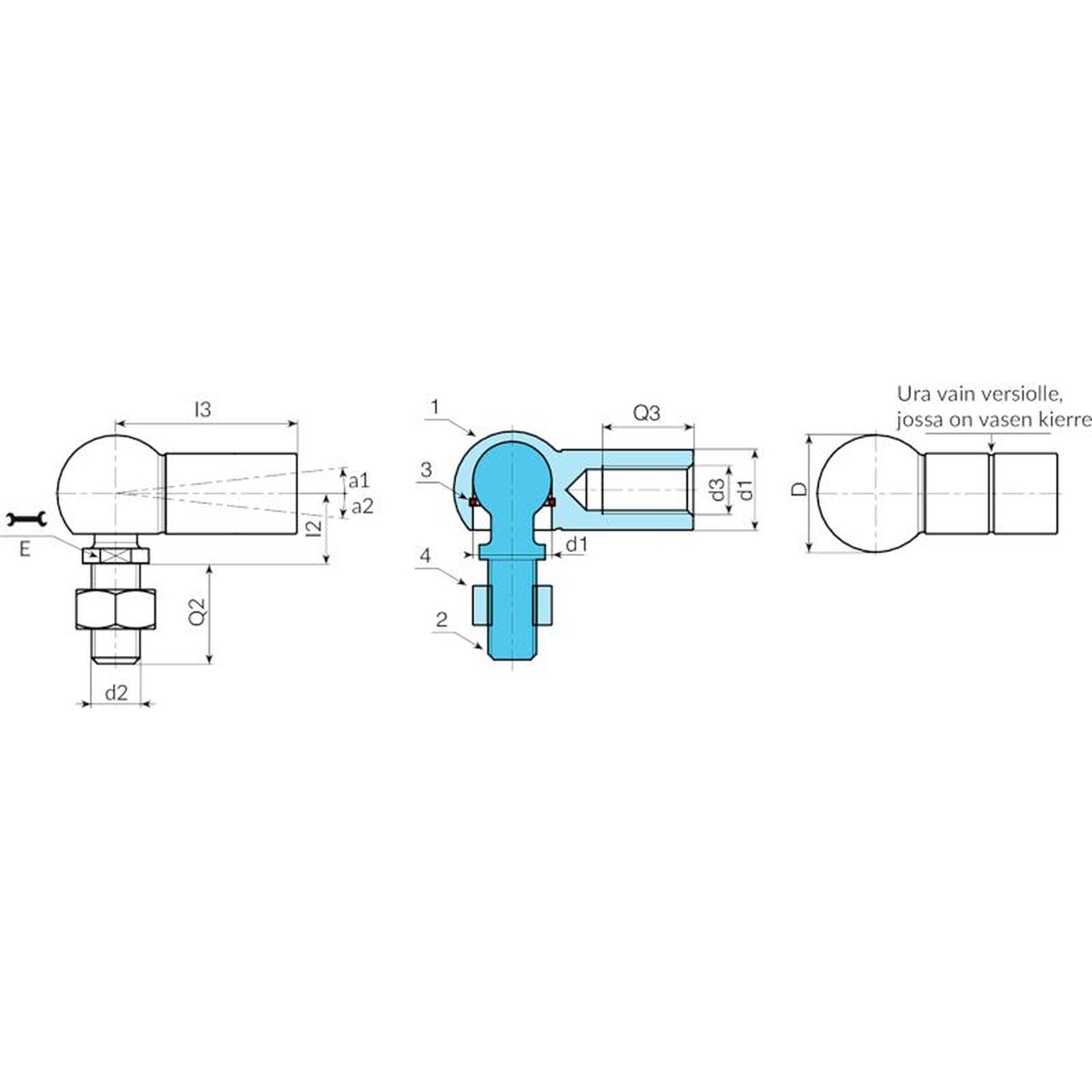 (1) Teräksinen pallonivel, kierteitetty reikä.